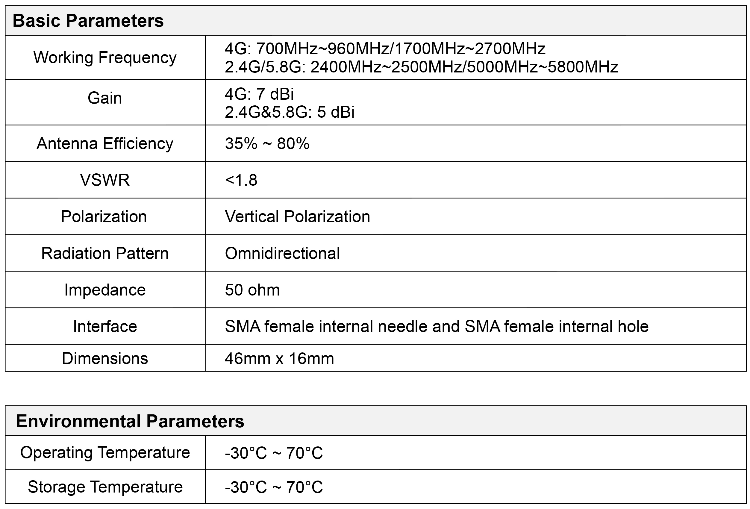 - Frequency Range: The antennas support a wide frequency range, covering 700MHz to 2700MHz for 4G and 2400MHz to 5800MHz for Wi-Fi, making them compatible with multiple network standards.