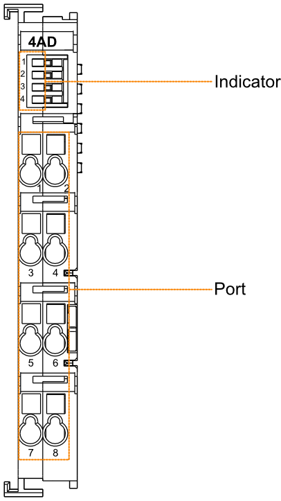 | 1~4 | AI1/C1~AI4/C4 | Green | 4 indicators correspond to AI1/C1~AI4/C4, which are independent of each other. The states of indicators are on, blink and off. - on: the module is powered on
