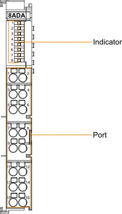| 1~8 | AI1/C1~AI8/C8 | Green | 8 indicators correspond to AI1/C1~AI8/C8, which are independent of each other. The states of indicators are on, blink and off. - on: the module is powered on