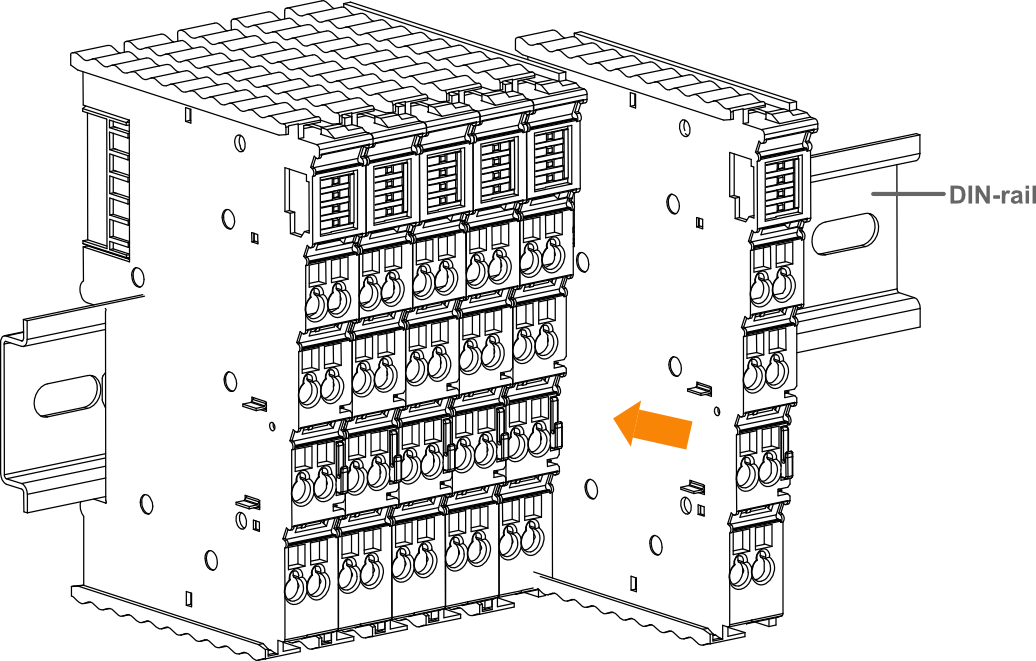 - Secure the I/O module to the DIN-rail by pushing the I/O module in the direction of the arrow onto the DIN snap pin.