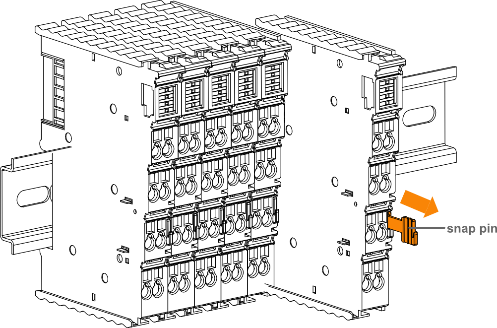 - Hold the snap pin of the I/O module by hand and then pull it out in the direction of the arrow to disengage the module from the DIN-rail.