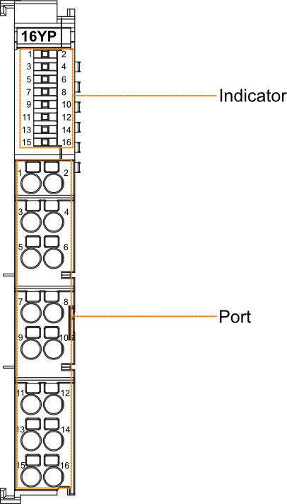 | 1~16 | Y1~Y16 | Green | 16 Indicators correspond to Y1~Y16, which are independent of each other. The states of indicators are on and off. - on: Output a high level signal