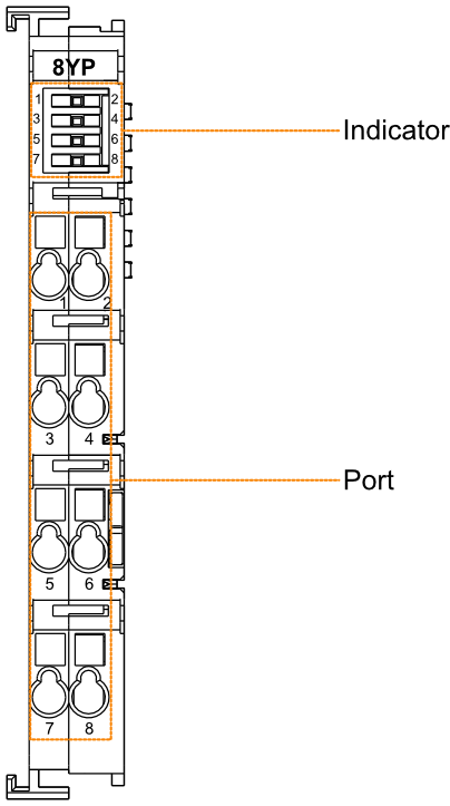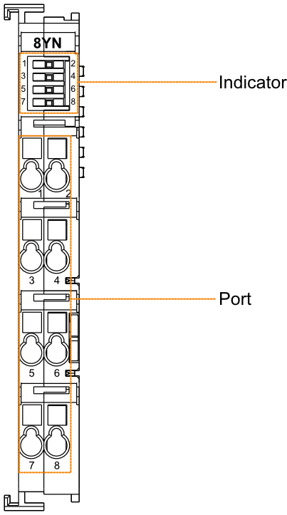 | 1~8 | Y1~Y8 | Green | 8 Indicators correspond to Y1~Y8, which are independent of each other. The states of indicators are on and off. - on: Output a high level signal
