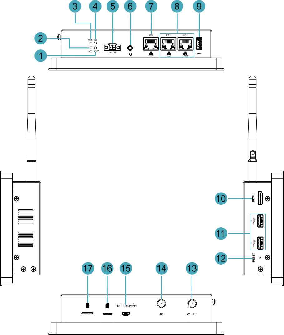 | 17 | 1 x Micro SD card slot, which is used to install Micro SD card. It supports booting the OS from Micro SD card. |