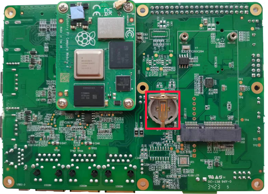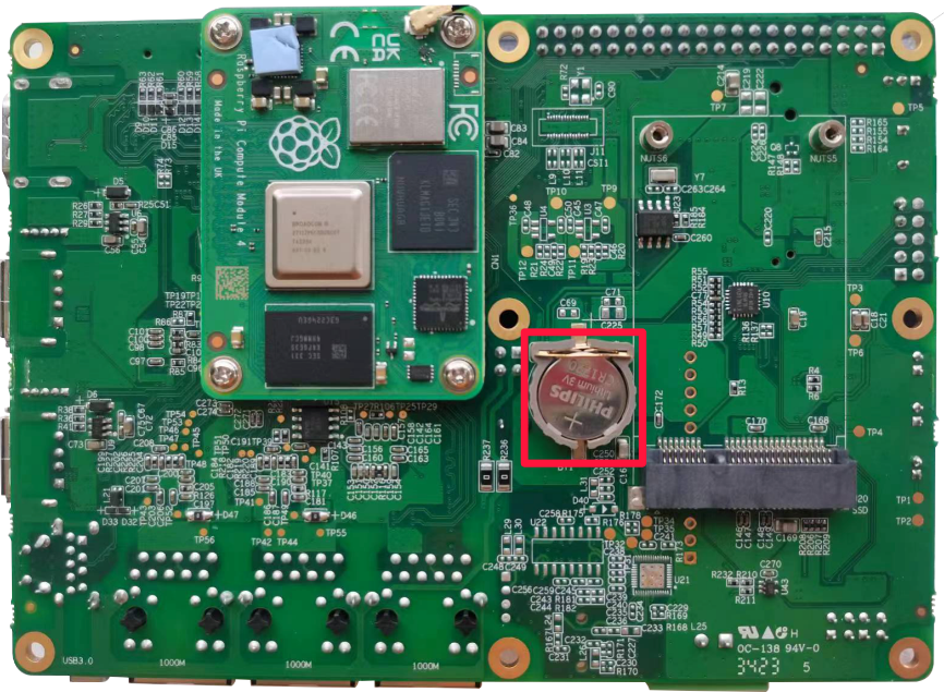 - Put the positive pole of the battery upwards and press it into the RTC base. The installation effect is as shown below.
