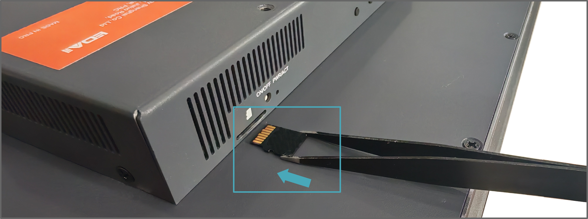 1. Position the SD card with contact pads facing upward, grip it with tweezers, and insert into the corresponding slot along the arrow direction until securely locked in place.