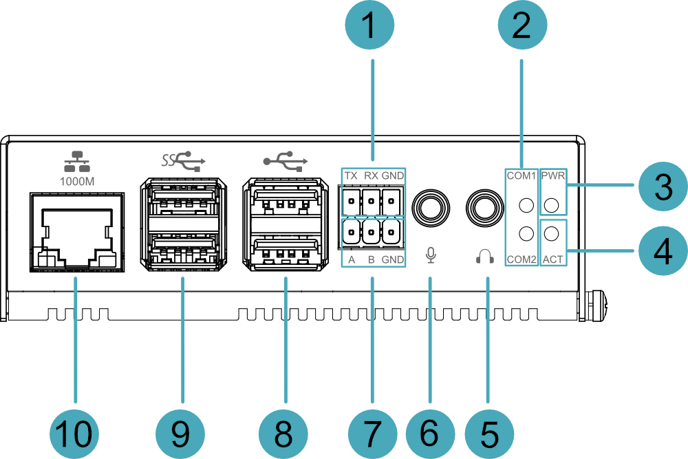 ED-IPC3020 includes 2 USB 3.0 ports, and the silkscreen is "". The connector is USB Type-A, which can connect to standard USB 3.0 peripherals and supports up to 5Gbps.
