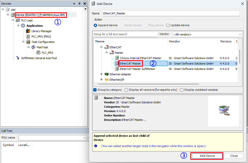 - Right-click “Device” and select “Add Device” in the menu to add the EtherCAT Master.