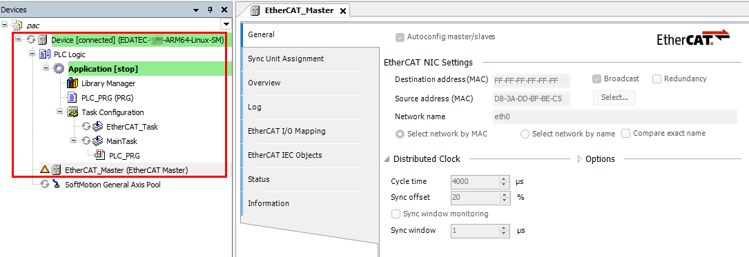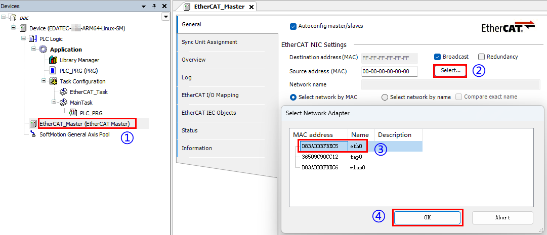 - Double-click on the EtherCAT Master device to set the source address (Select the EtherCAT port, which corresponds to the device's eth0 port).