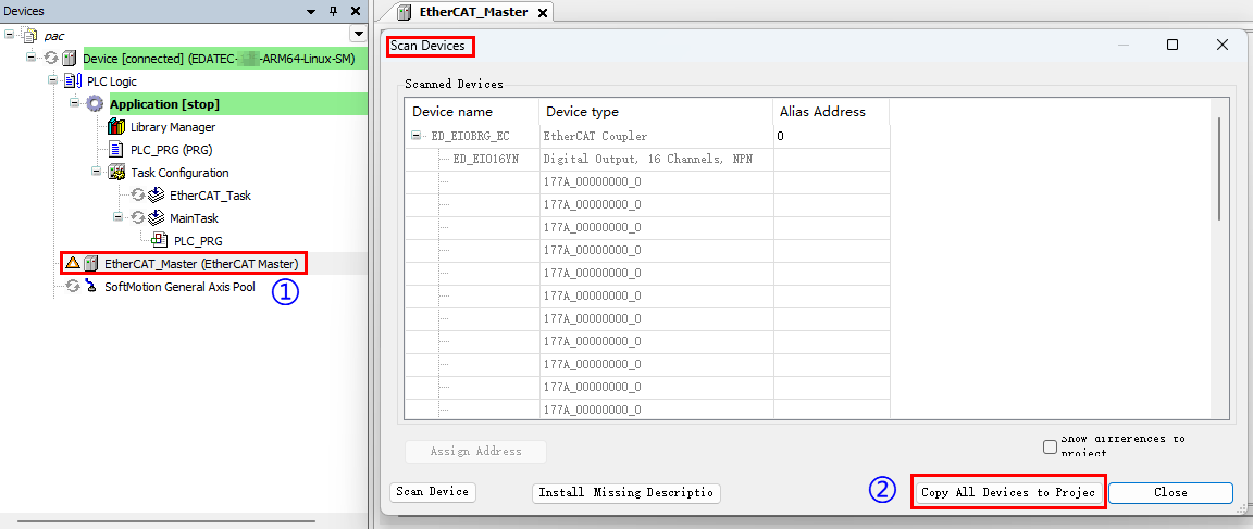 - Click on the EtherCAT Master device, select “Scan for Devices” in the right-click menu, and copy all devices to the project after scanning is completed.