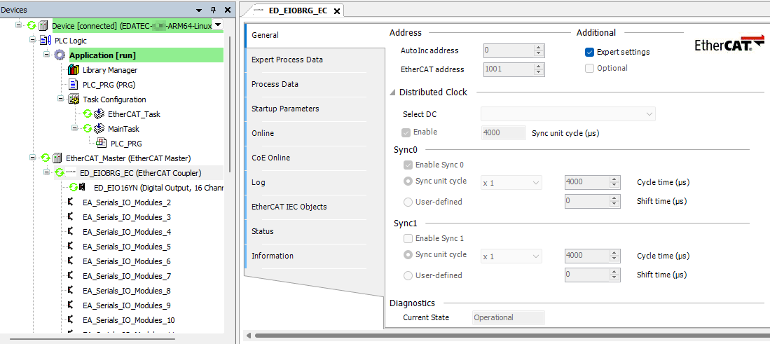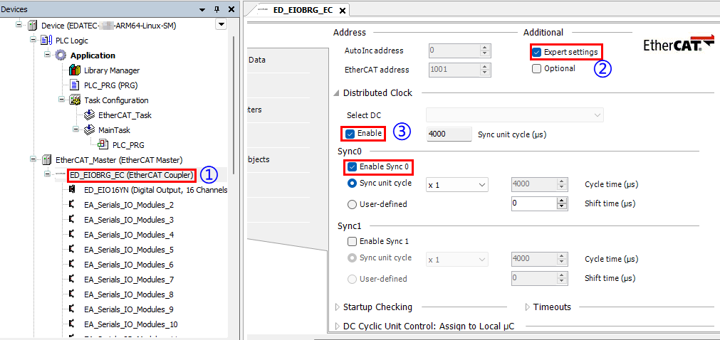 Double-click the slave device, configure the relevant parameters in the right-hand interface, enable "Expert settings", select "Enable" under Select DC section, and select "Enable Sync0".