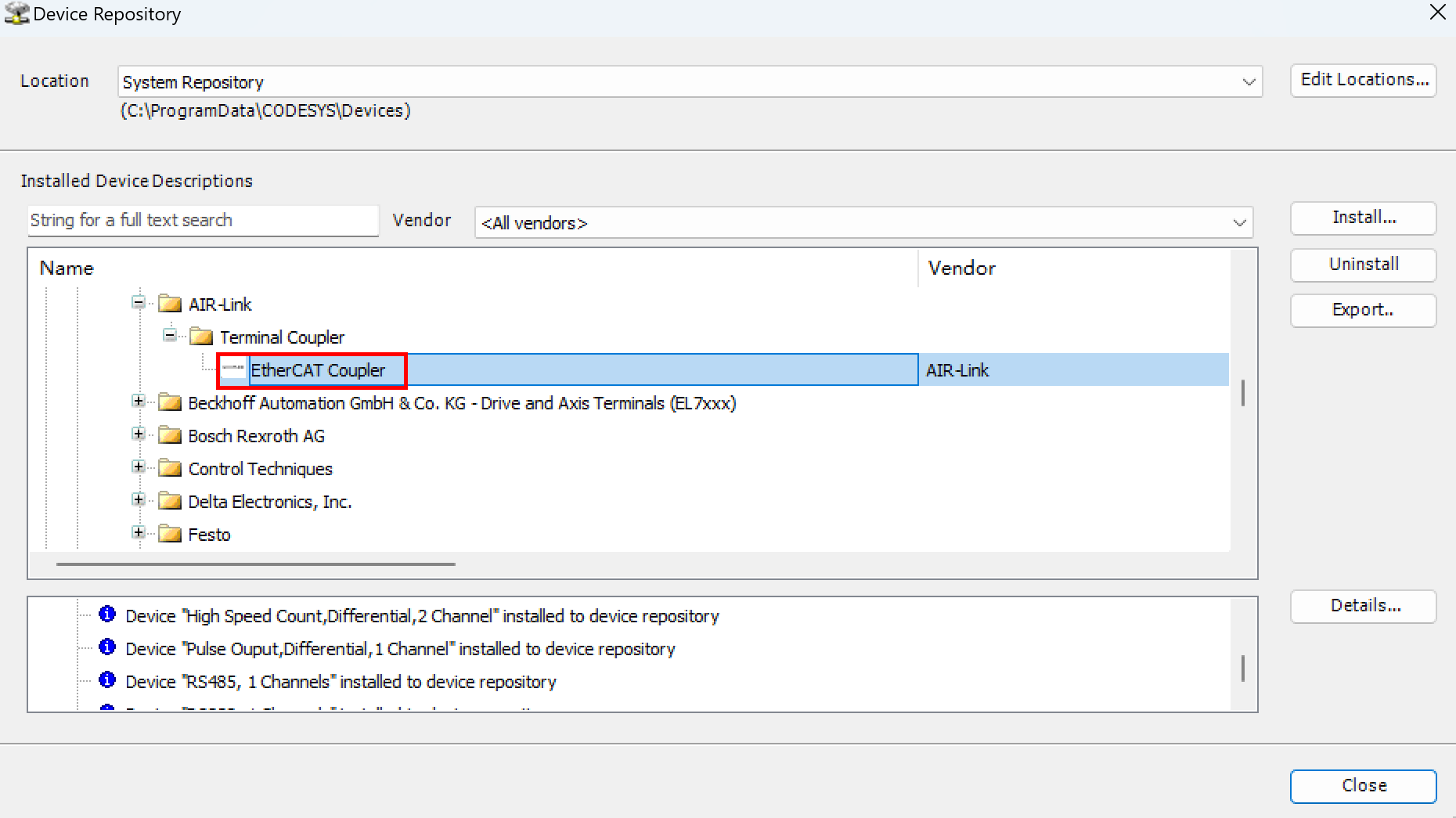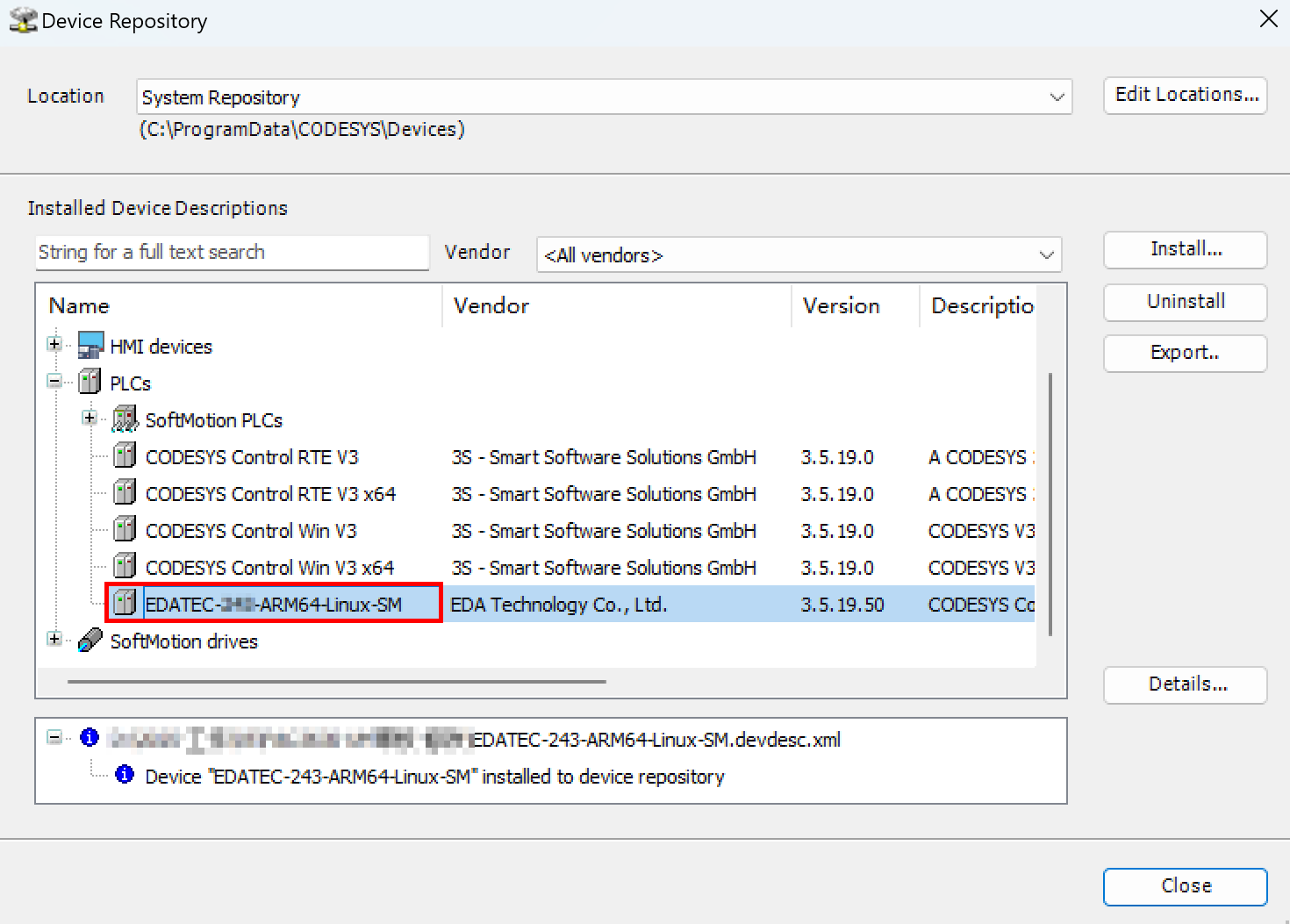 After successful installation, you can verify in the "Device Repository" that the device description file have been added successfully.