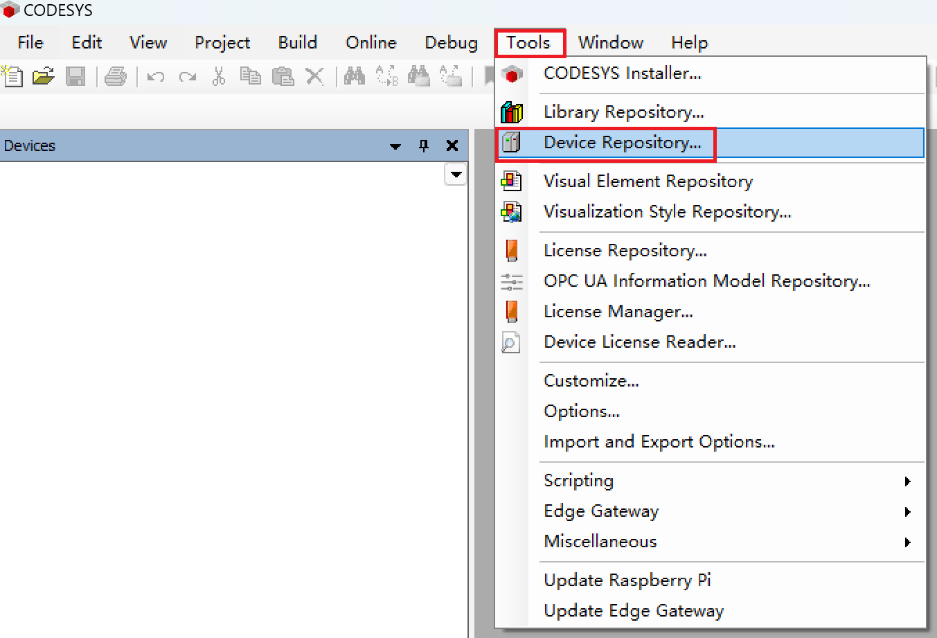 - Double-click the CODESYS icon on the PC desktop to open the CODESYS software. From the menu bar, select “Tools” → “Device Repository”.