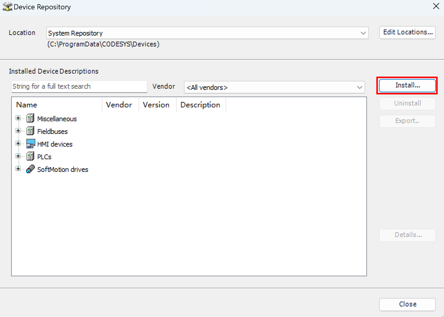 - In the opened "Device Repository" pane, click "Install".