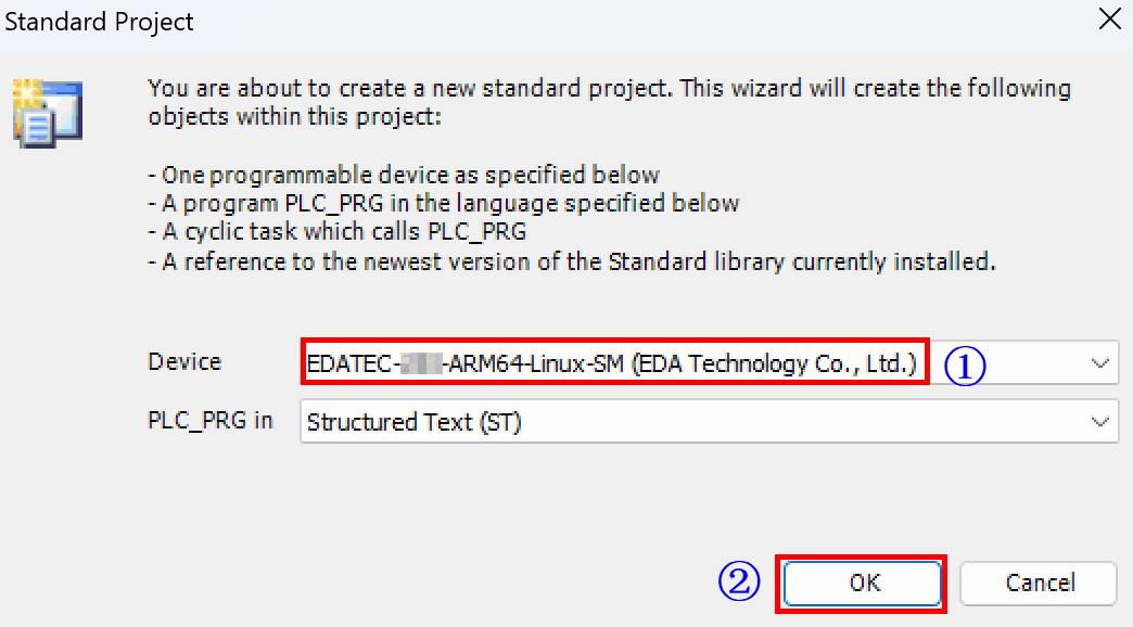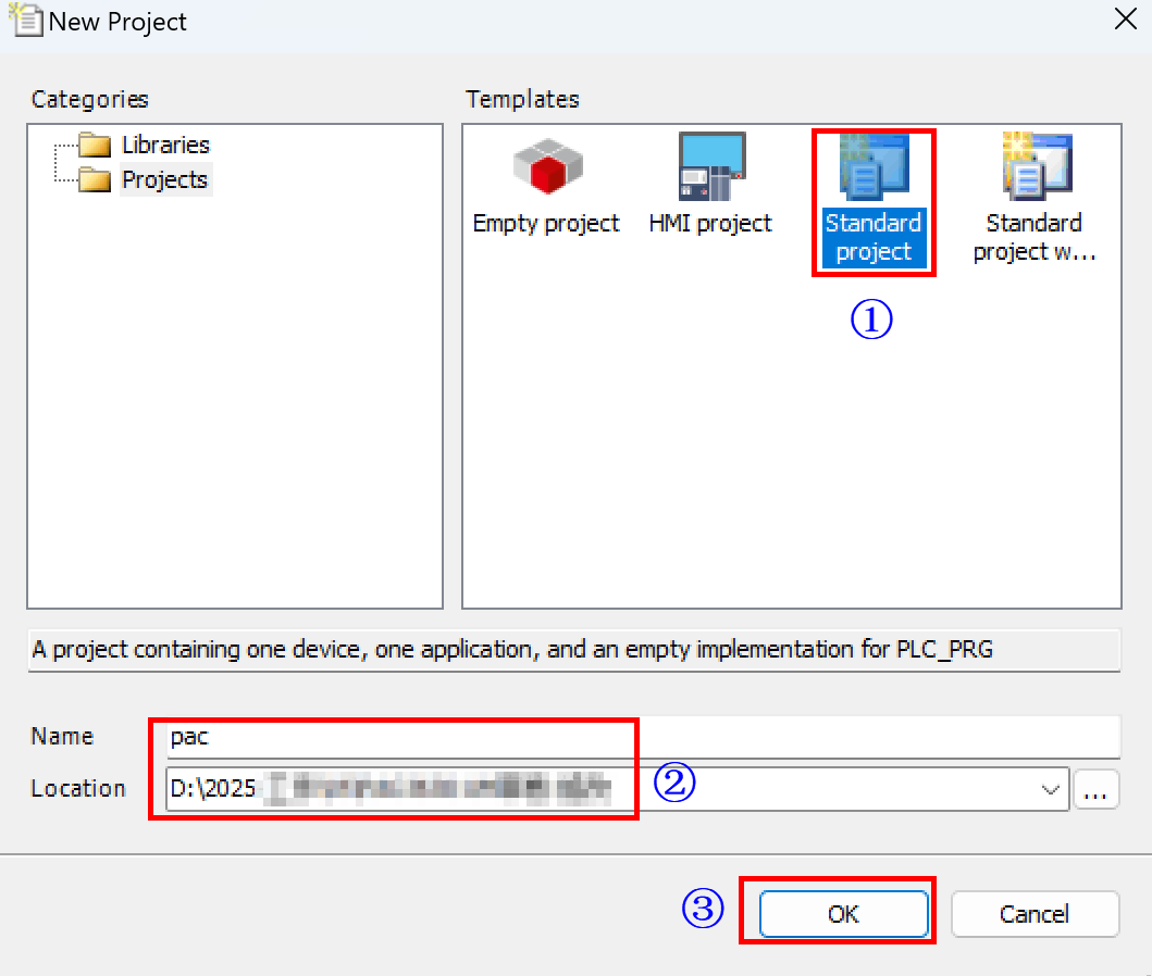 - Power on the ED-PAC3020 and the remote I/O modules. Open the CODESYS software on the PC, select "File" → "New Project" in the menu bar to open the "New Project" pane, and create a standard project.