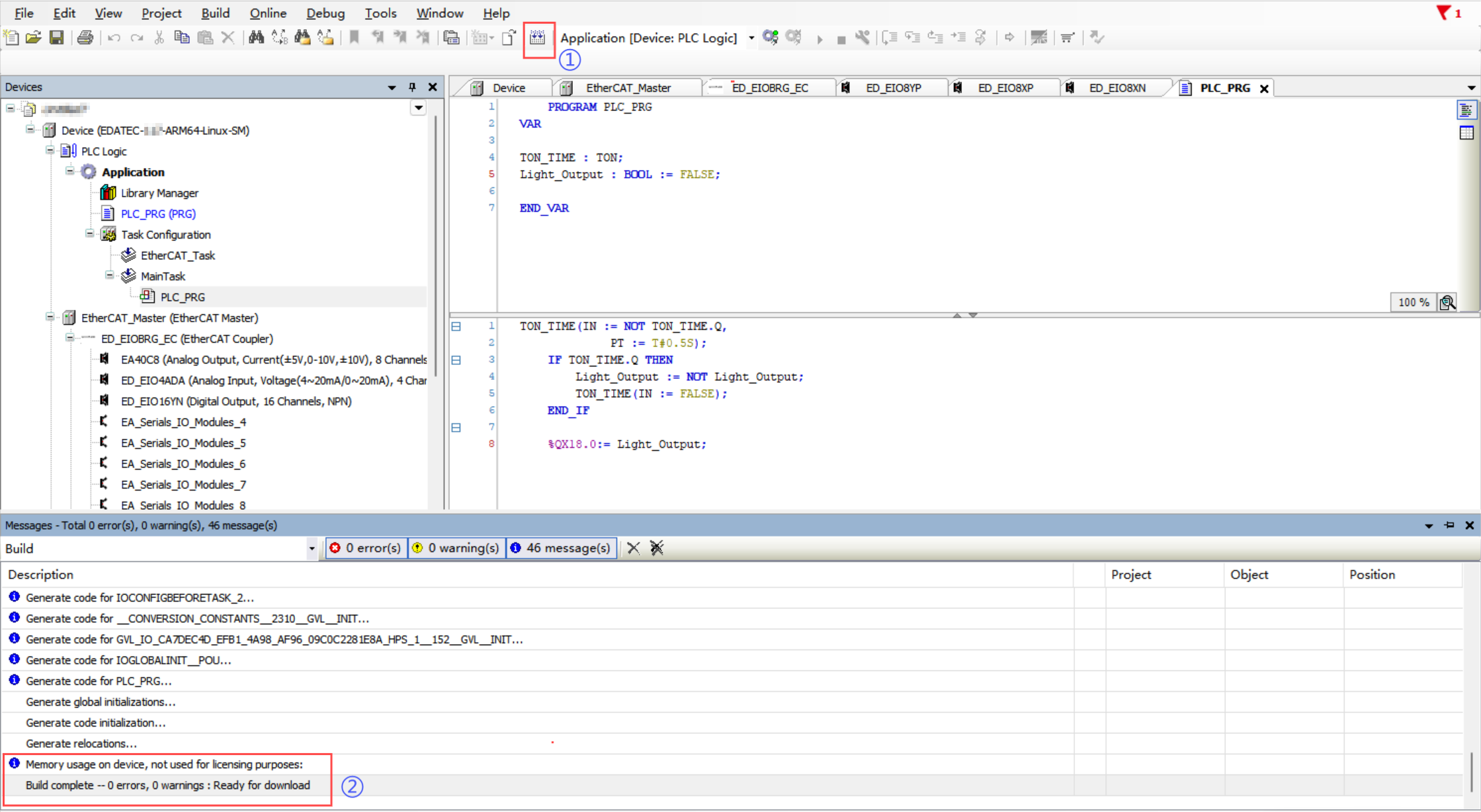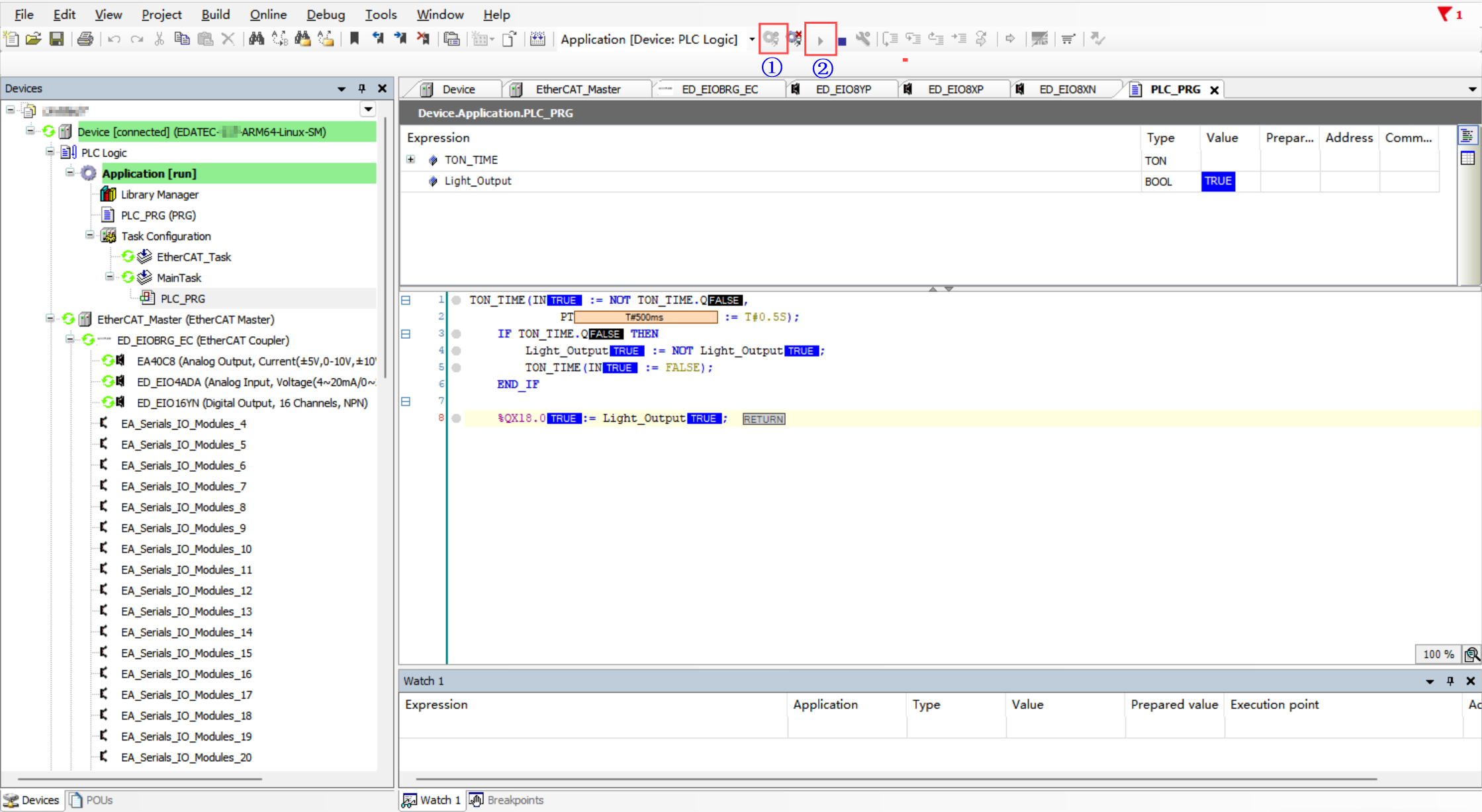 - Click Login to download the program to the device, then click Run to observe the LED blinking every 0.5 seconds.