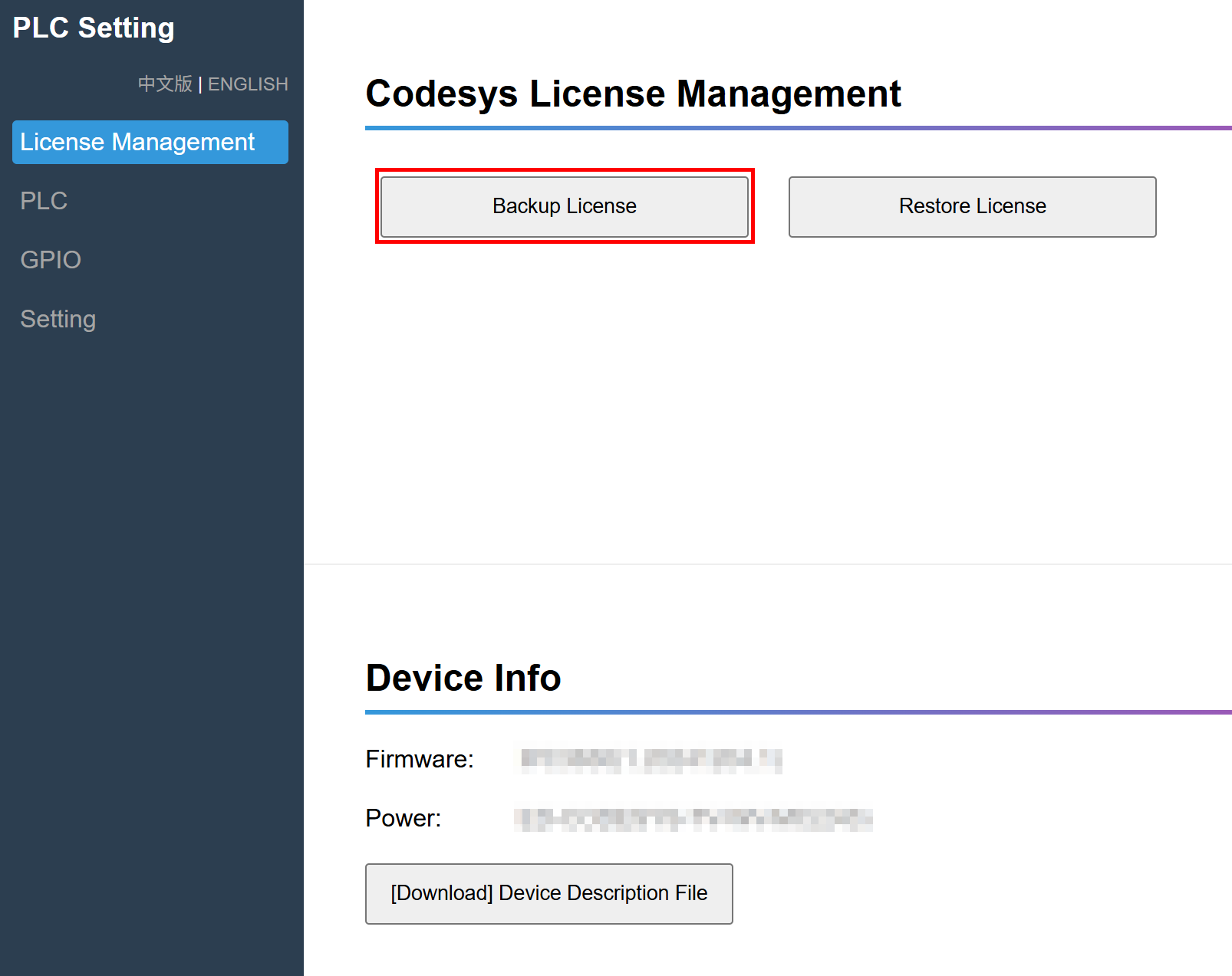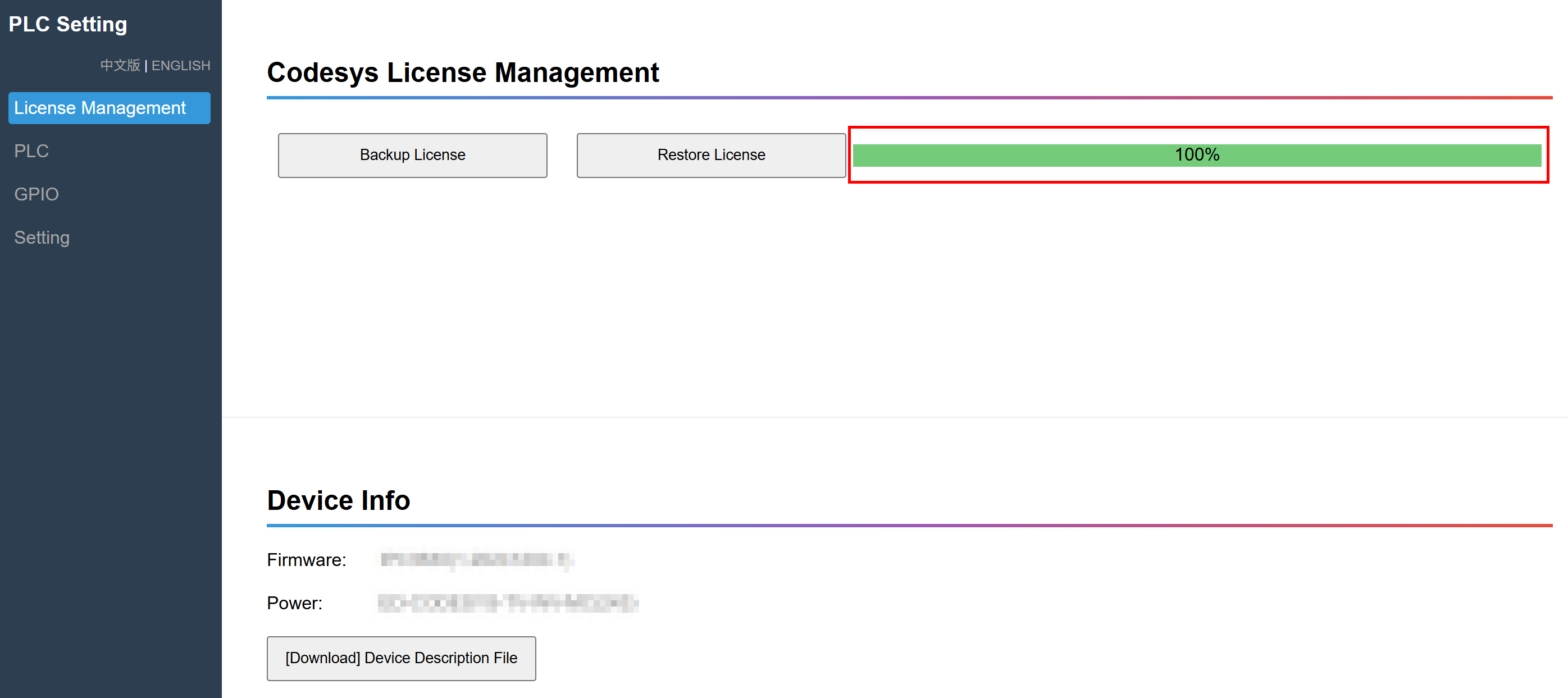 http://192.168.0.100:8100to access the "PLC Setting" interface.Under "Codesys License Management", click "Backup License" to download the license file and save it locally.