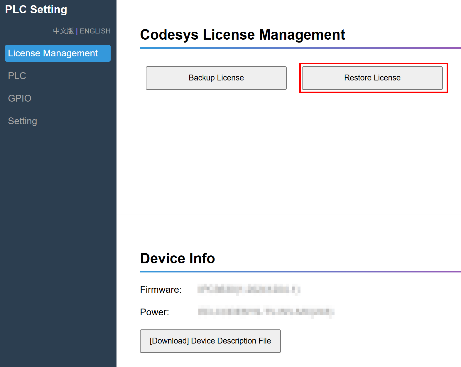 http://192.168.0.100:8100to access the "PLC Setting" interface.Under "Codesys License Management", click "Restore License".