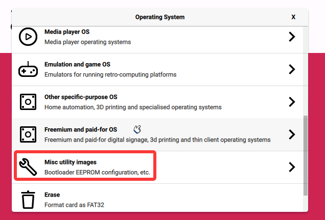 - Click "CHOOSE OS" and select "Misc utility images" in the pop-up pane.