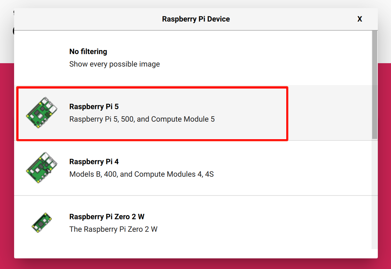 Open Raspberry Pi Imager, click "Rarpberry Pi Device"and select "Raspberry Pi 5".