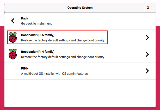 - Based on the product model (ED-HMI3010/ED-HMI3020), select "Bootloader (Pi 5 family)" in the pop-up pane.