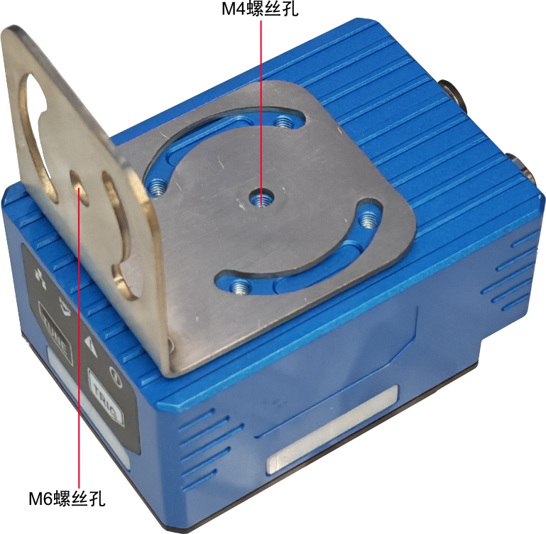 - 在中央螺丝孔的位置插入1颗带垫圈的M4螺钉,再使用M4的内六角螺丝刀将M4螺钉顺时针拧紧将支架固定在设备上。