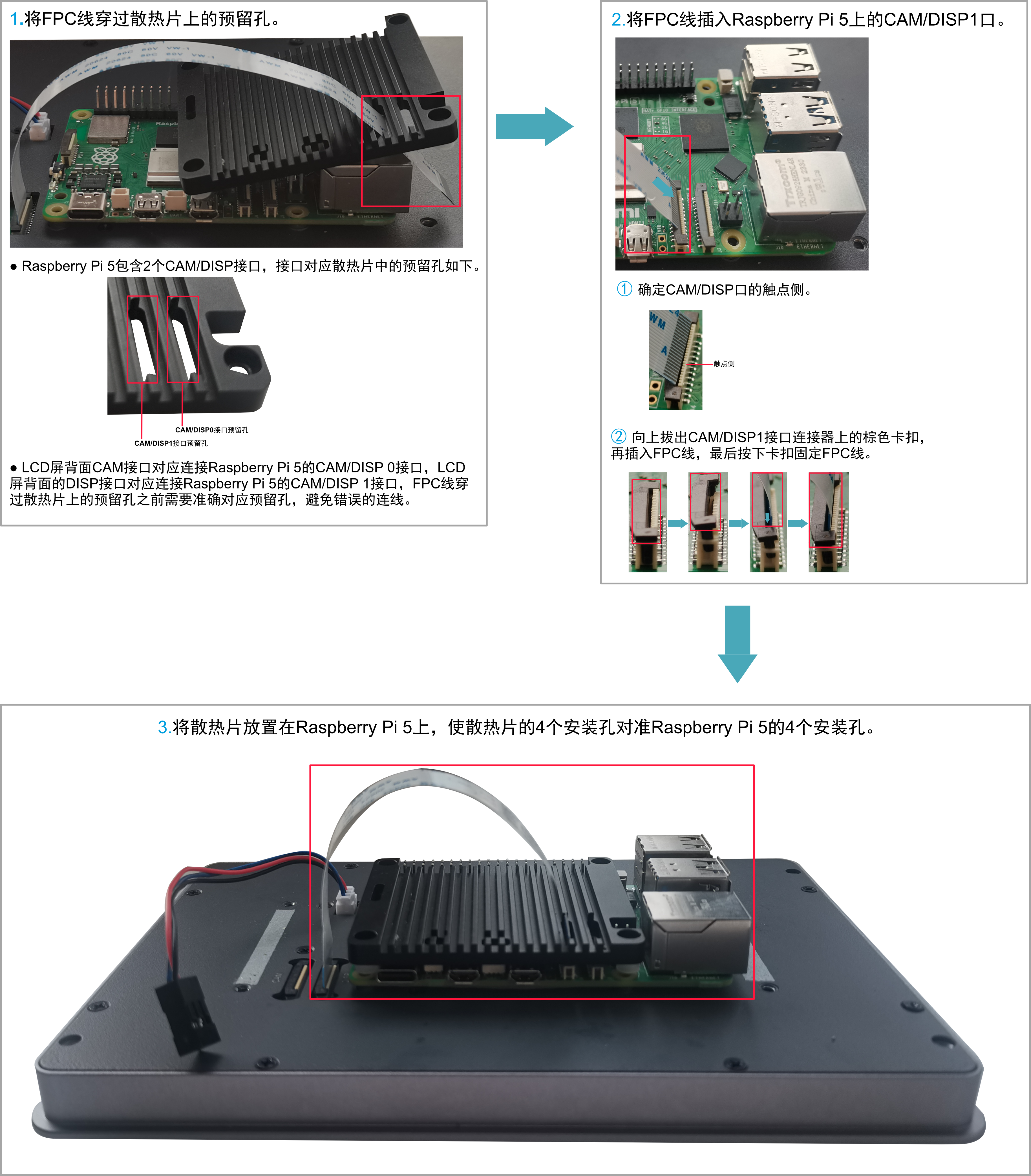 此处仅以在不带CAM接口的LCD屏上安装Raspberry Pi 5为例。