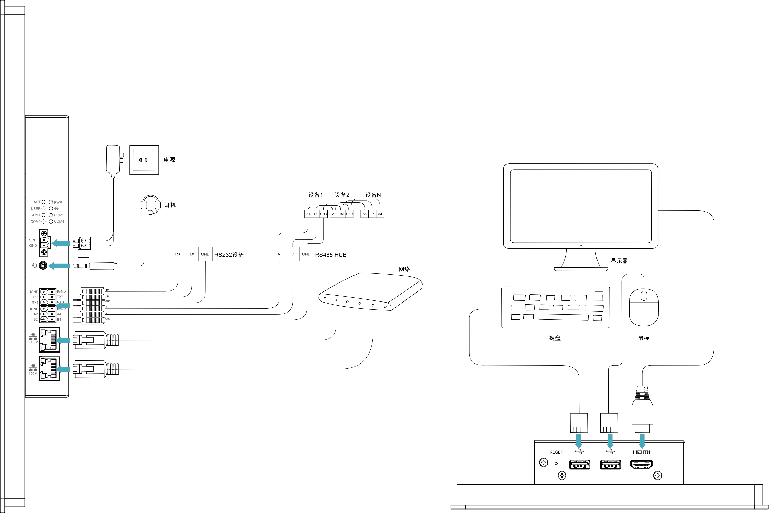 各接口的引脚定义以及连线的具体方法,请参见1.6接口。