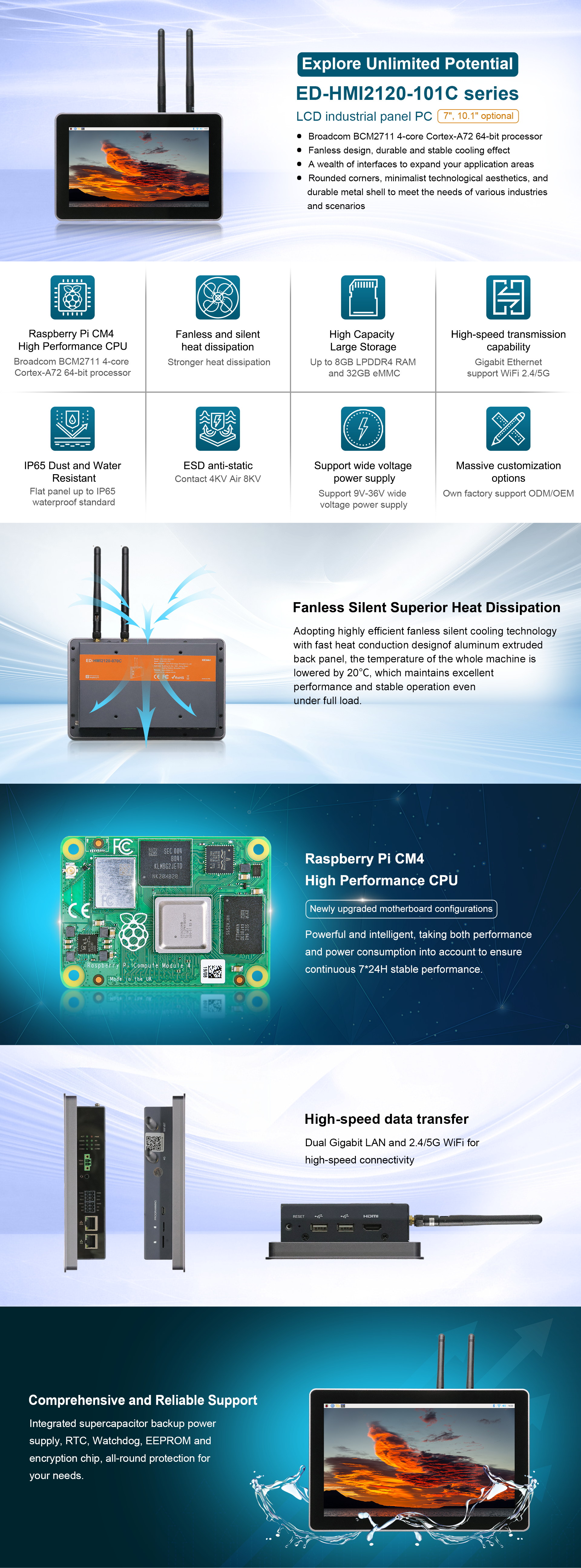 The ED-HMI2120 comes in two display sizes: a 7.0" model (ED-HMI2120-070C) with a resolution of 1024 x 600 and a 10.1" model (ED-HMI2120-101C) with a resolution of 1280x800. Both feature 16.7 million colors, LED backlighting, and a contrast ratio of 800:1 and 1000:1 respectively. The touchscreen is a multi-point capacitive type with a transmittance of ≥85%, supporting up to 10 points of touch and a surface hardness of 6H.