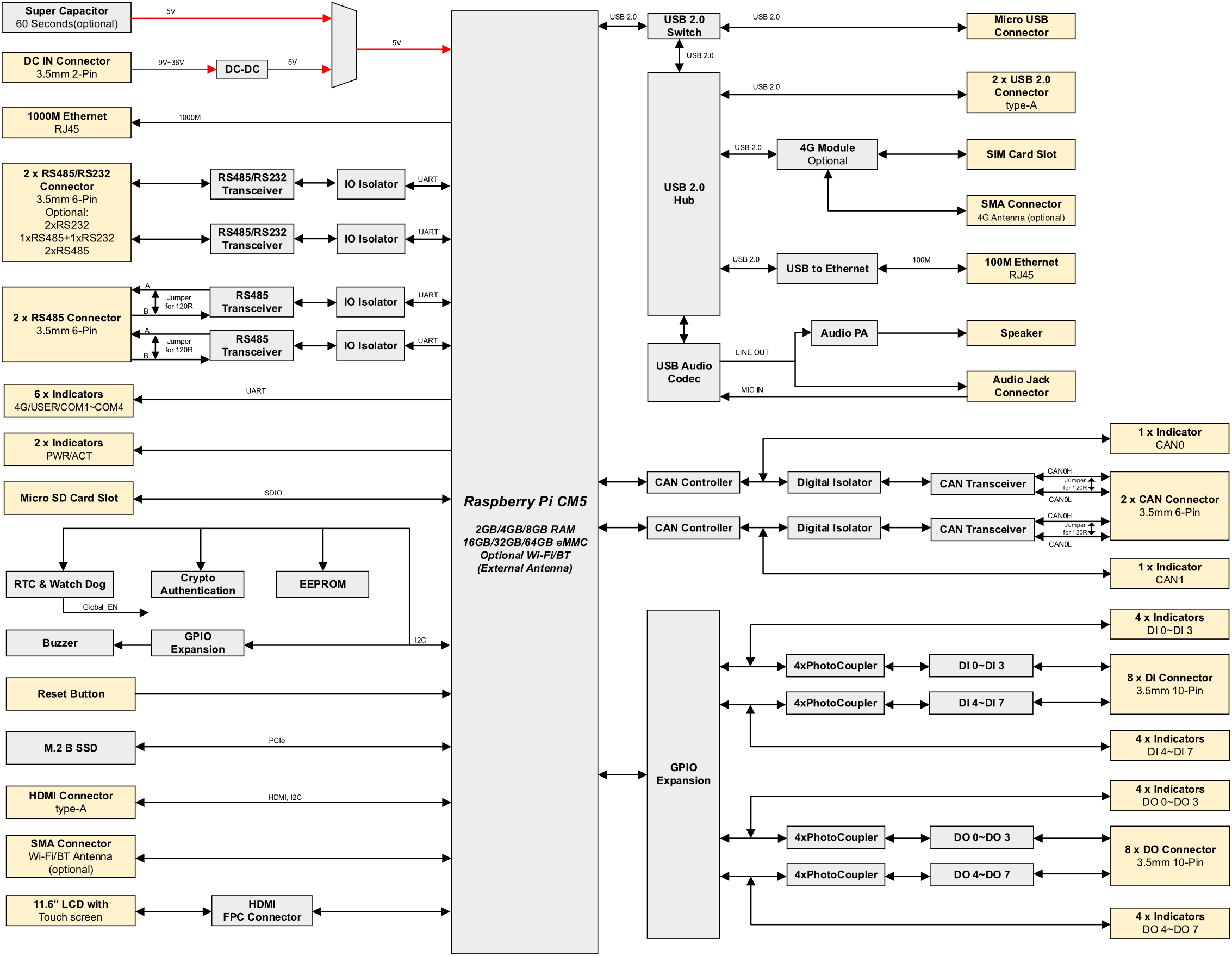 A high-density industrial control terminal designed for mission-critical automation and complex bus communication scenarios. Built on Raspberry Pi CM5 architecture, it integrates 8 isolated DI/DO, 2 CAN buses, and 4 isolated serial ports, delivering all-protocol connectivity and scalability for smart manufacturing, transportation control, and energy management applications.
