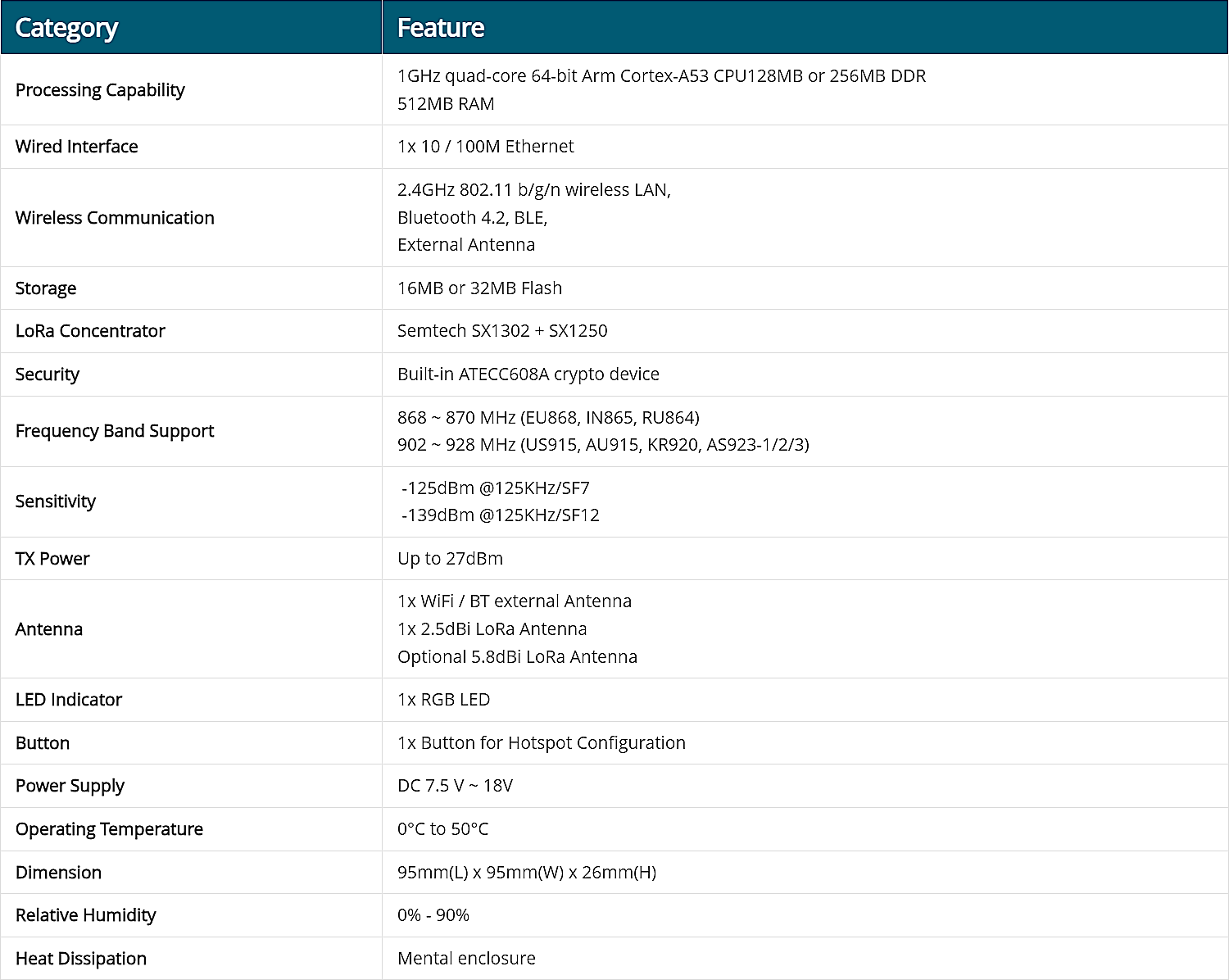The device is also equipped with a built-in ATECC608A crypto device for enhanced security, supporting various frequency bands that cater to different regions, including Europe, India, Russia, and the United States.