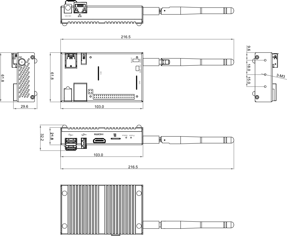 Powering the CM4 Nano is straightforward with an 8V to 18V DC input, and it provides 5V@2A and 3.3V@1.5A output power through the 40PIN socket, supporting high-power expansion modules. The device's PCB dimensions are 95x58mm, and it is equipped with a 103x62x5mm heatsink for excellent cooling performance, ensuring reliable operation in high-temperature environments. The CM4 Nano has been tested to operate reliably in ambient temperatures ranging from -25 to 60°C.