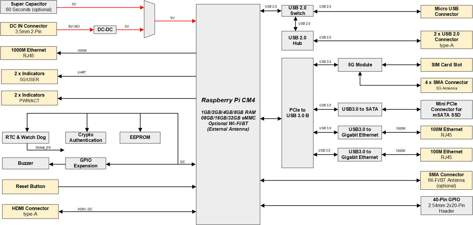 The ED-IPC2500 also includes reset and power buttons, along with various indicators such as a 5G signal indicator, a system activity light, and a user-definable indicator. For expansion, it offers 12V 1A and 5V 1A DC output connectors, a 40-Pin GPIO header compatible with CM4, and a 10-Pin GPIO header for custom functions. USB 2.0 ports and a Mini PCIe connector for SSD connectivity are also available for additional expansion possibilities.