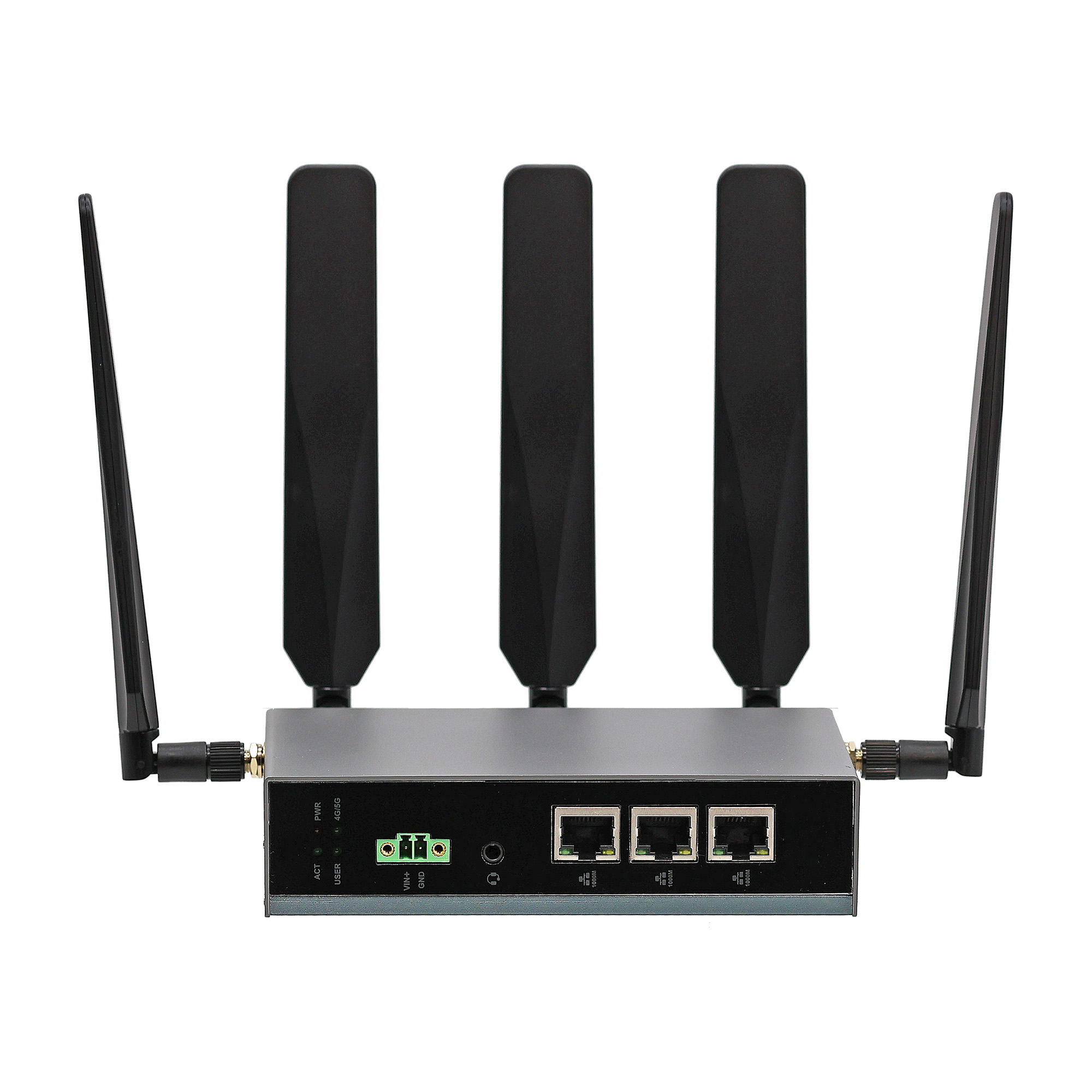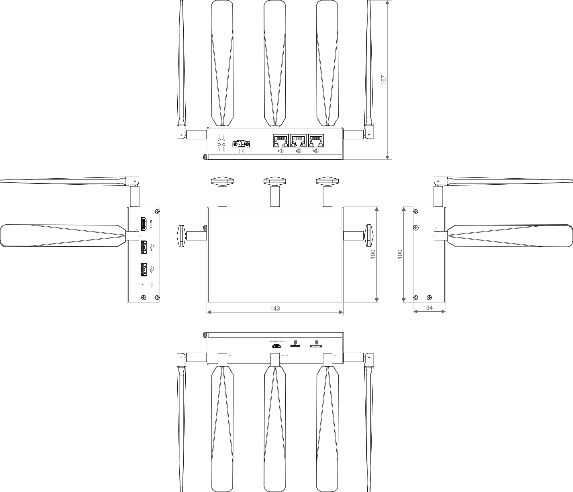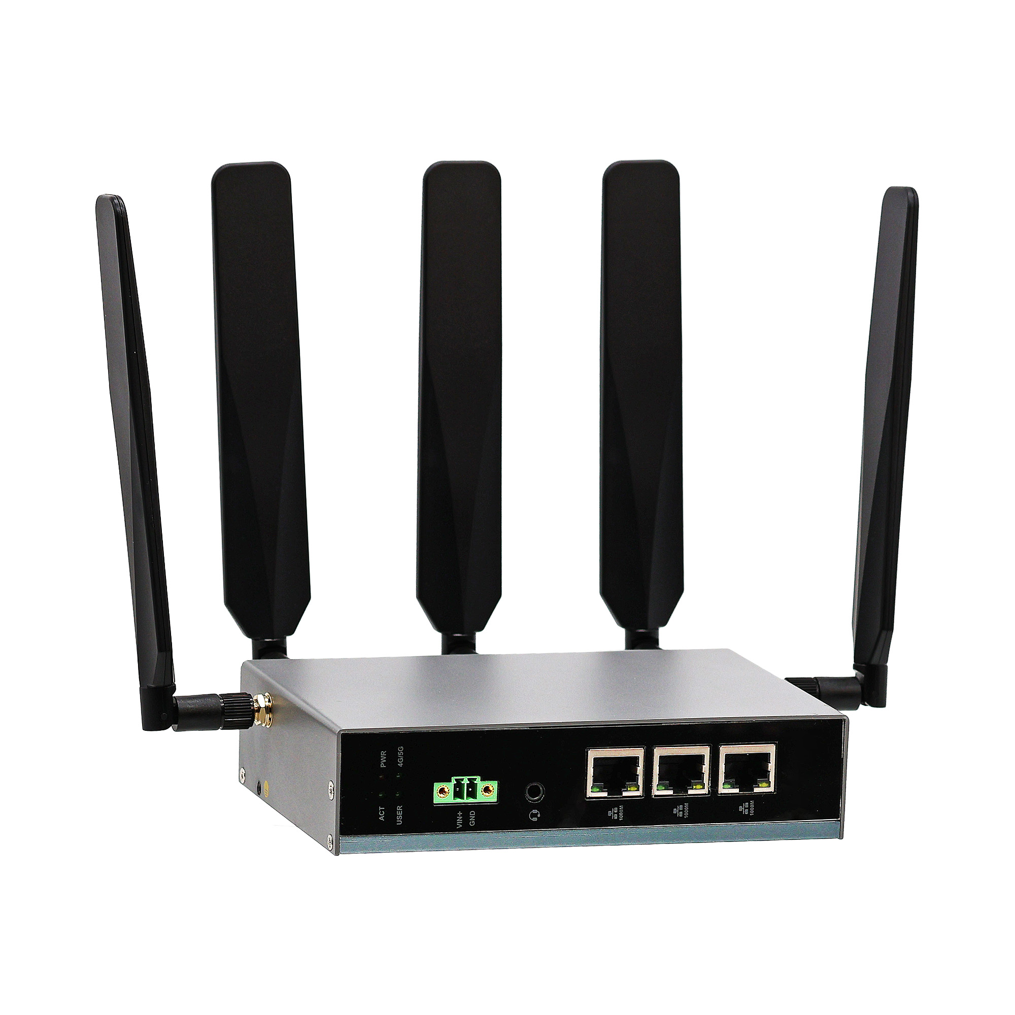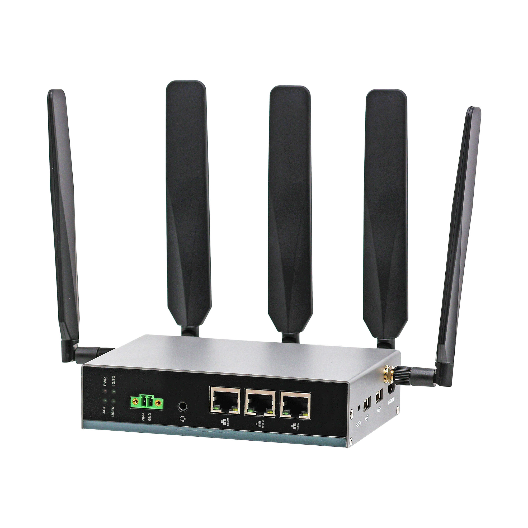 The front of the unit features DC power input and three Gigabit Ethernet ports for network access. On the rear, a Micro-SD card slot allows for OS booting, a Nano SIM card slot enables 5G connectivity, and a Micro USB port is available for system flashing. Side I/O includes an HDMI port and two USB 2.0 ports, along with SMA ports for connecting 5G antennas.