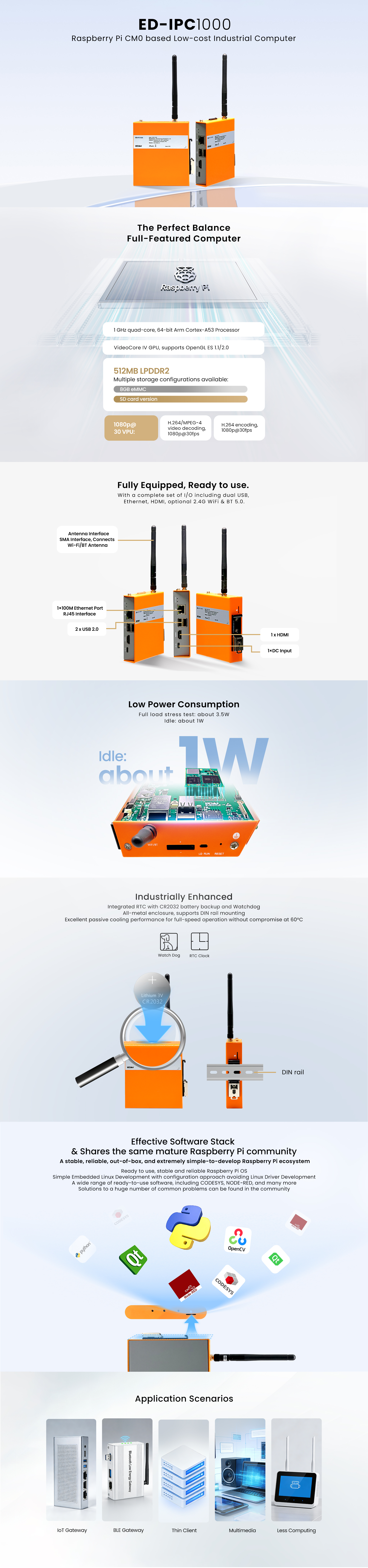 The ED-IPC1000 is an industrial computer that perfectly balances performance, power consumption, and cost. It is based on the ED-CM0NANO single-board computer, equipped with the latest Raspberry Pi Compute Module Zero (CM0), and features a rugged metal enclosure with passive cooling. Supporting DIN rail mounting, it can be easily integrated into existing systems. Its extensive interface configuration includes Ethernet, USB, HDMI, and optional WLAN and Bluetooth with external antenna support, ensuring flexible connectivity.