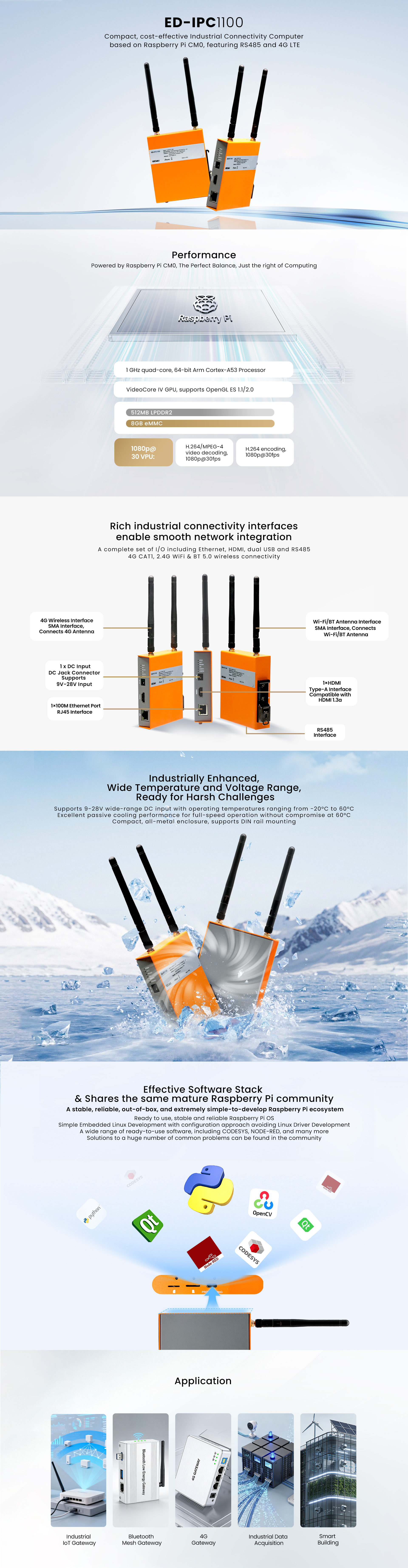 ED-IPC1100 is suitable for a wide range of applications such as industrial data acquisition, Bluetooth Mesh gateways, Industrial IoT, and 4G computing, offering an excellent cost-effective industrial connectivity solution.