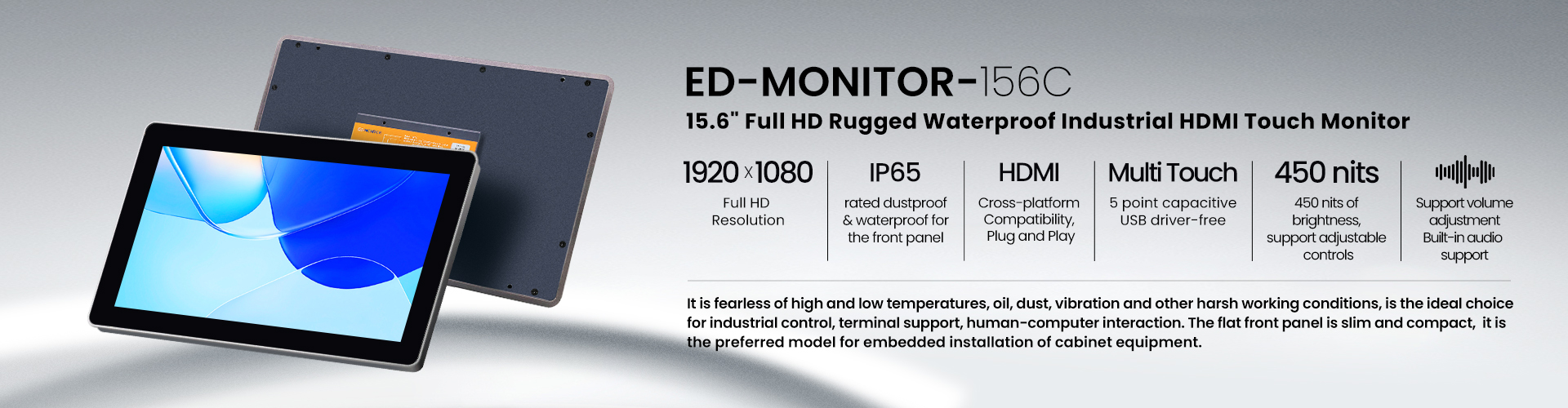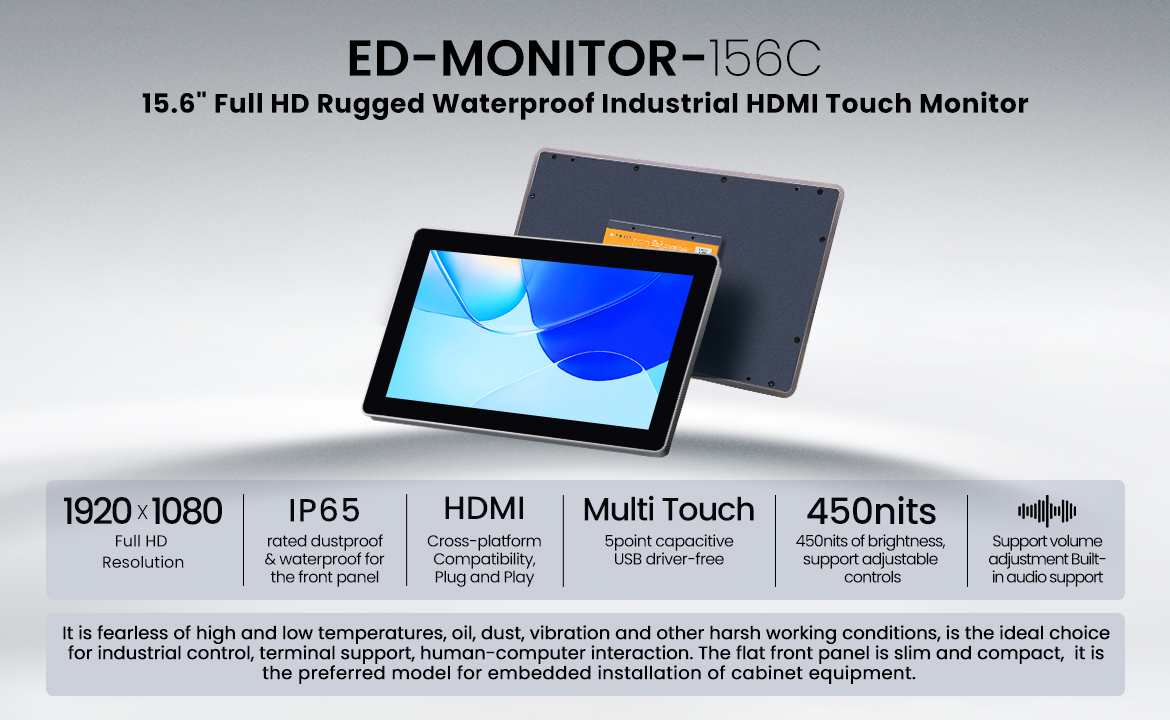 ED-MONITOR-156C is an 15.6” industrial HDMI touch monitor. The flat front panel is slim and compact, with IP65 grade dustproof and waterproof process, it is the preferred model for embedded installation of cabinet equipment. With a resolution of up to 1920 x 1080, it supports USB multi-touch, is drive-free and ready to use, and has a built-in audio output interface, which is perfectly adapted to Raspberry Pi and other platforms. Aluminum alloy screen frame and sheet metal shell mechanical design, enhance the mechanical rigidity of the machine, anti-interference and heat dissipation performance.It is fearless of high and low temperatures, oil, dust, vibration and other harsh working conditions, is the ideal choice for industrial control, terminal support, human-computer interaction.