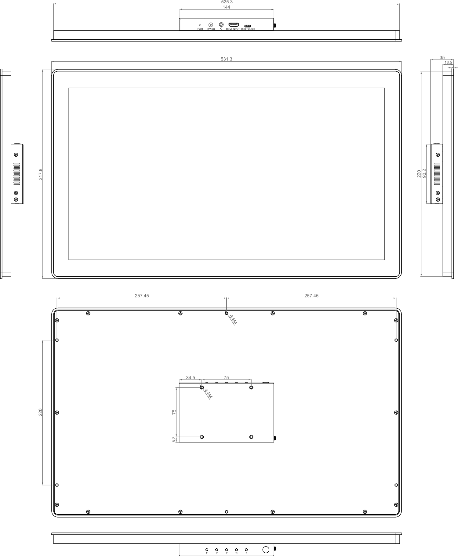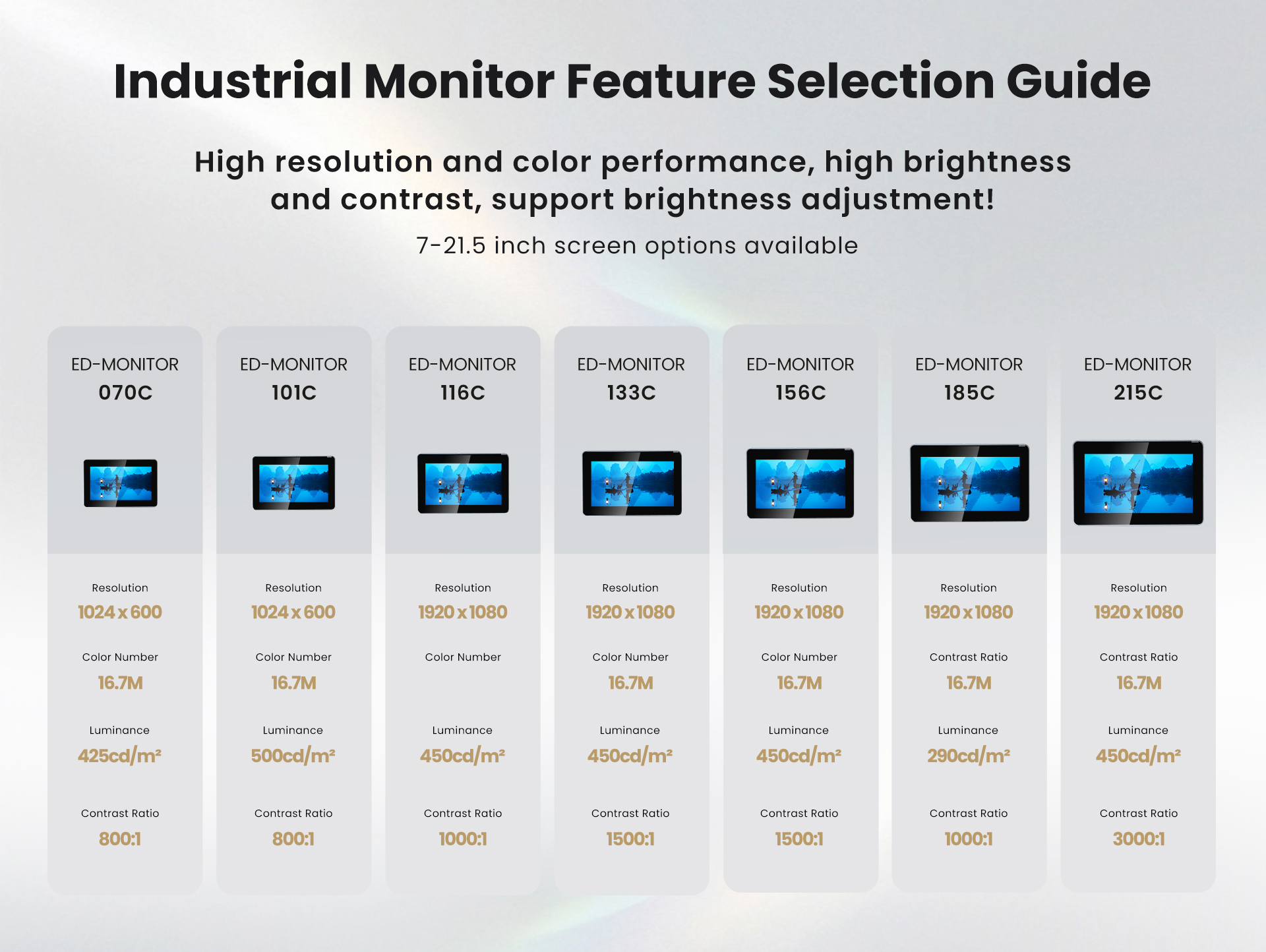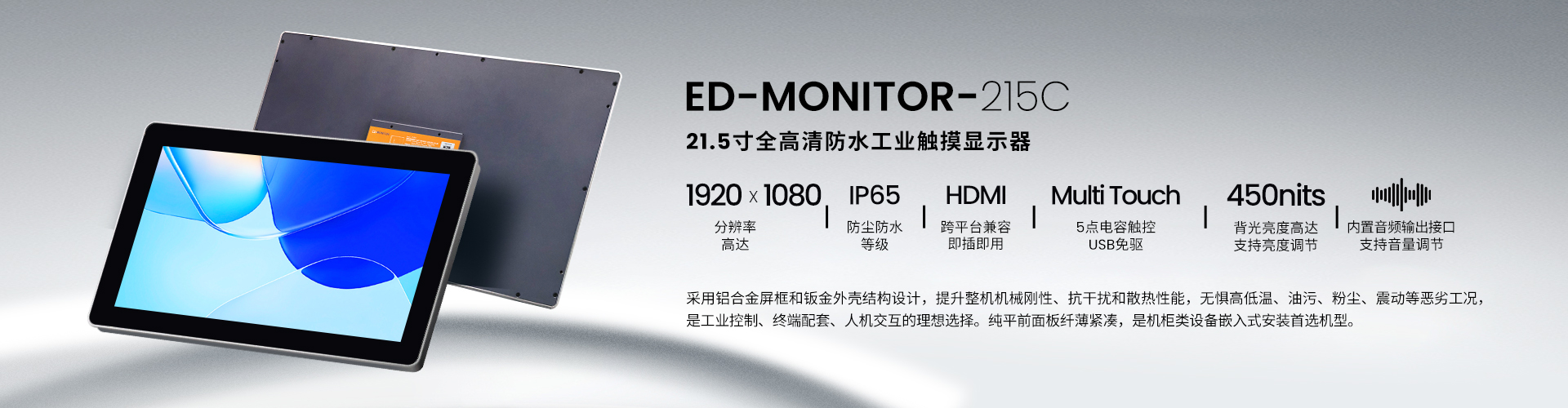 ED-MONITOR-215C is an 21.5” industrial HDMI touch monitor. The flat front panel is slim and compact, with IP65 grade dustproof and waterproof process, it is the preferred model for embedded installation of cabinet equipment. With a resolution of up to 1920 x 1080, it supports USB multi-touch, is drive-free and ready to use, and has a built-in audio output interface, which is perfectly adapted to Raspberry Pi and other platforms. Aluminum alloy screen frame and sheet metal shell mechanical design, enhance the mechanical rigidity of the machine, anti-interference and heat dissipation performance.It is fearless of high and low temperatures, oil, dust, vibration and other harsh working conditions, is the ideal choice for industrial control, terminal support, human-computer interaction.