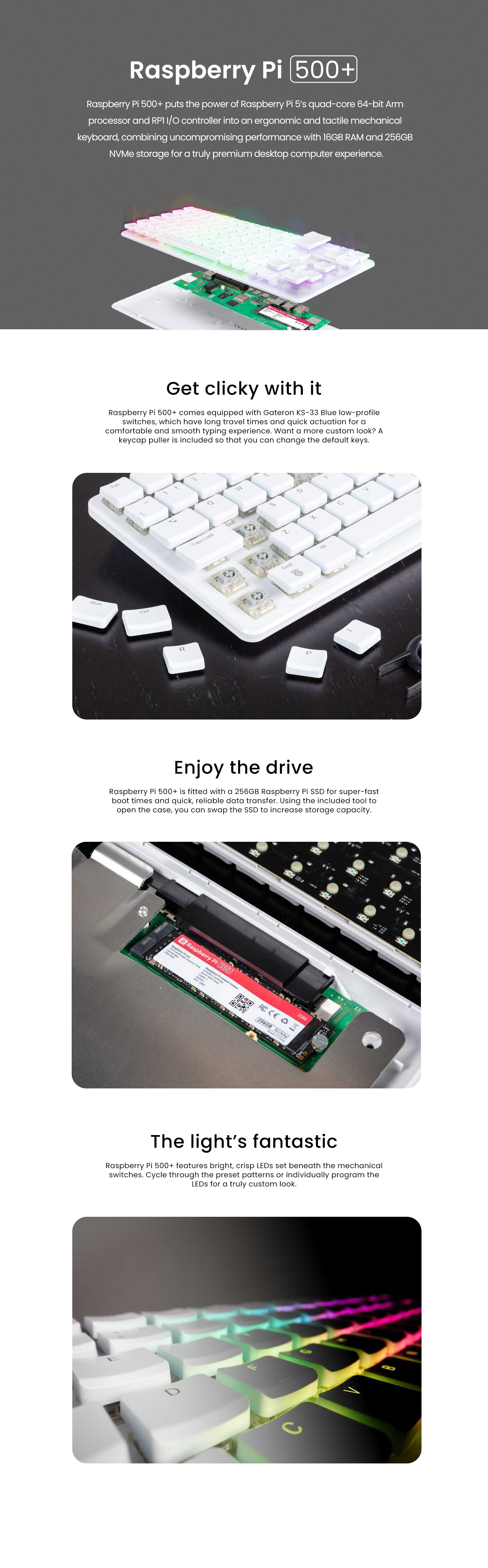 Raspberry Pi 500+ features 16GB of LPDDR4X-4267 SDRAM to handle the most memory-intensive workloads, and a pre-installed 256GB Raspberry Pi SSD for blazingly fast I/O performance. Clicky Gateron KS-33 Blue mechanical keyboard switches are paired with ergonomic low-profile keycaps and individually addressable RGB LEDs.