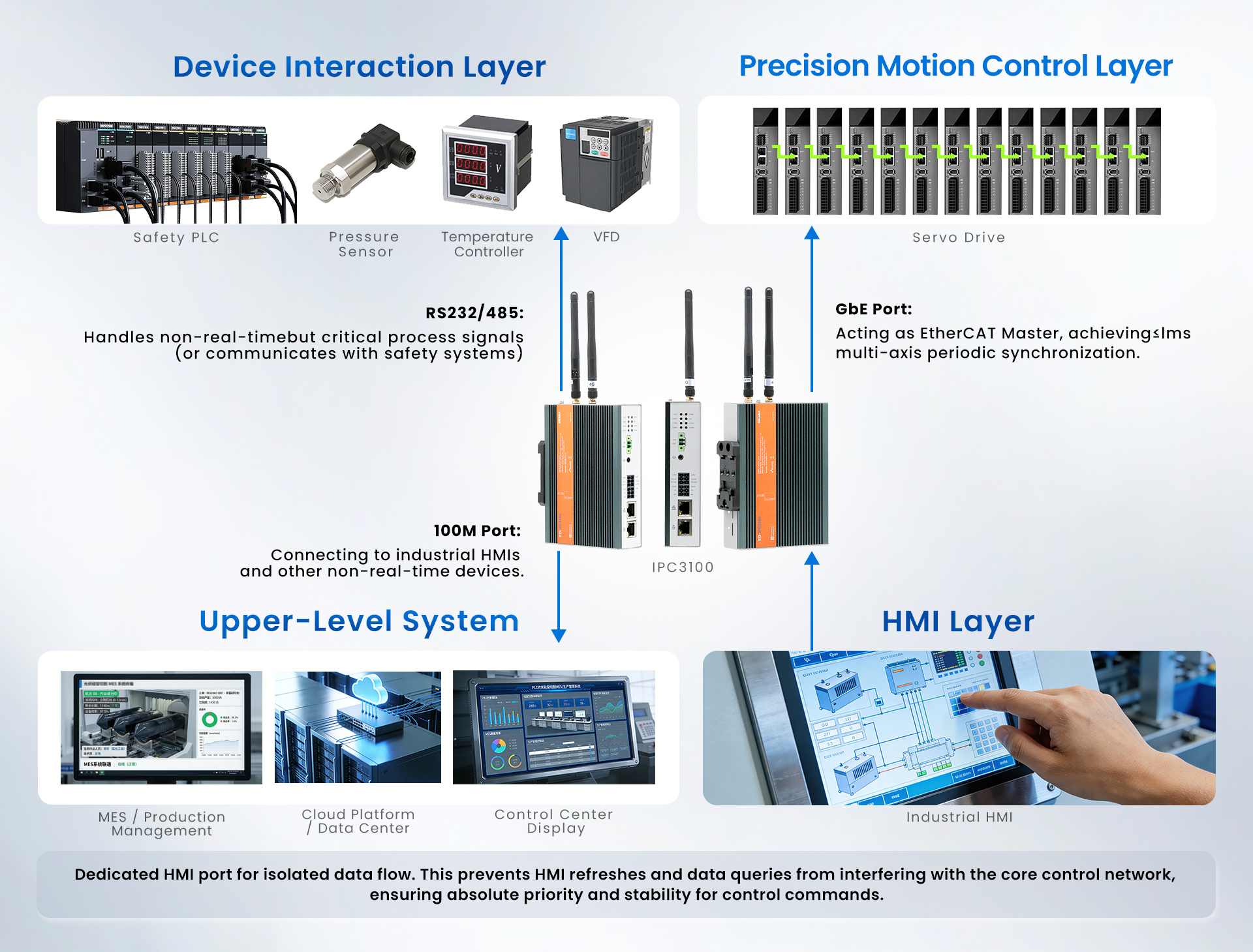✅ Unified Architecture: One device to receive HMI commands, execute precision cutting via EtherCAT (≤1ms sync), and stream real-time data to monitoring dashboards.