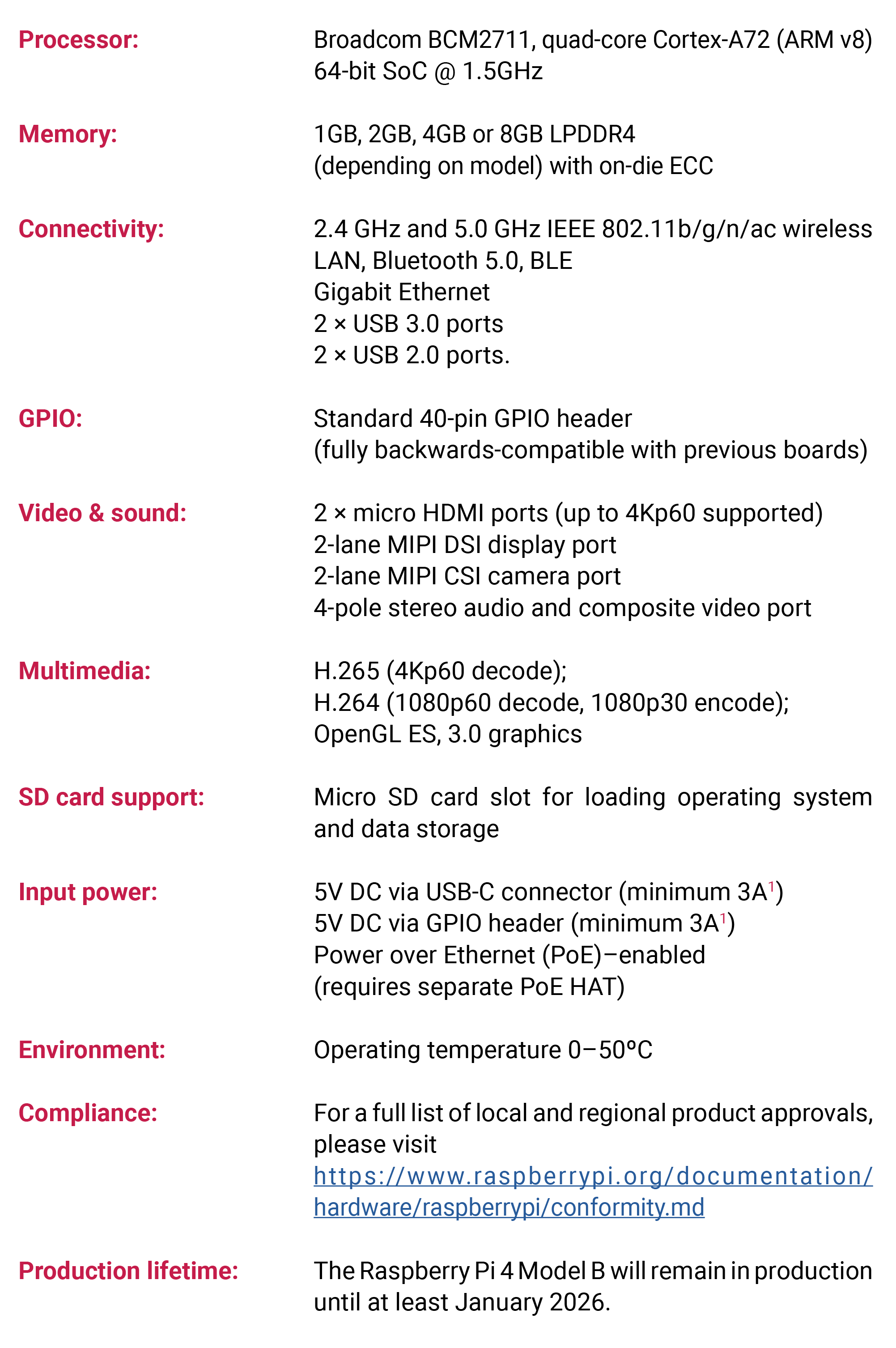 For connectivity, the Raspberry Pi 4 Model B includes dual-band 2.4GHz and 5.0GHz wireless LAN, Bluetooth 5.0, and Gigabit Ethernet. This array of connectivity options ensures that the device can be integrated into various networks and used in different scenarios, from IoT projects to media streaming.