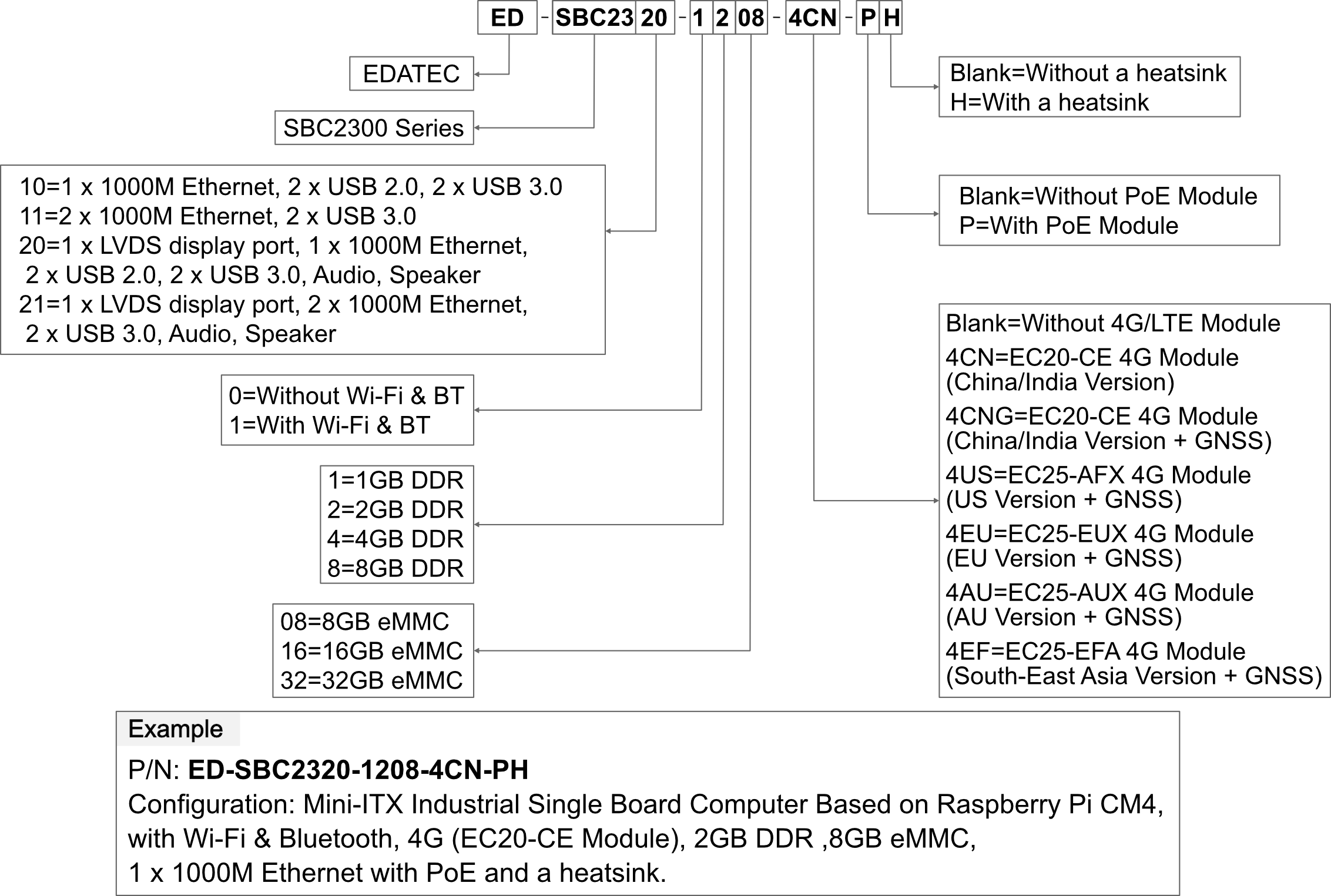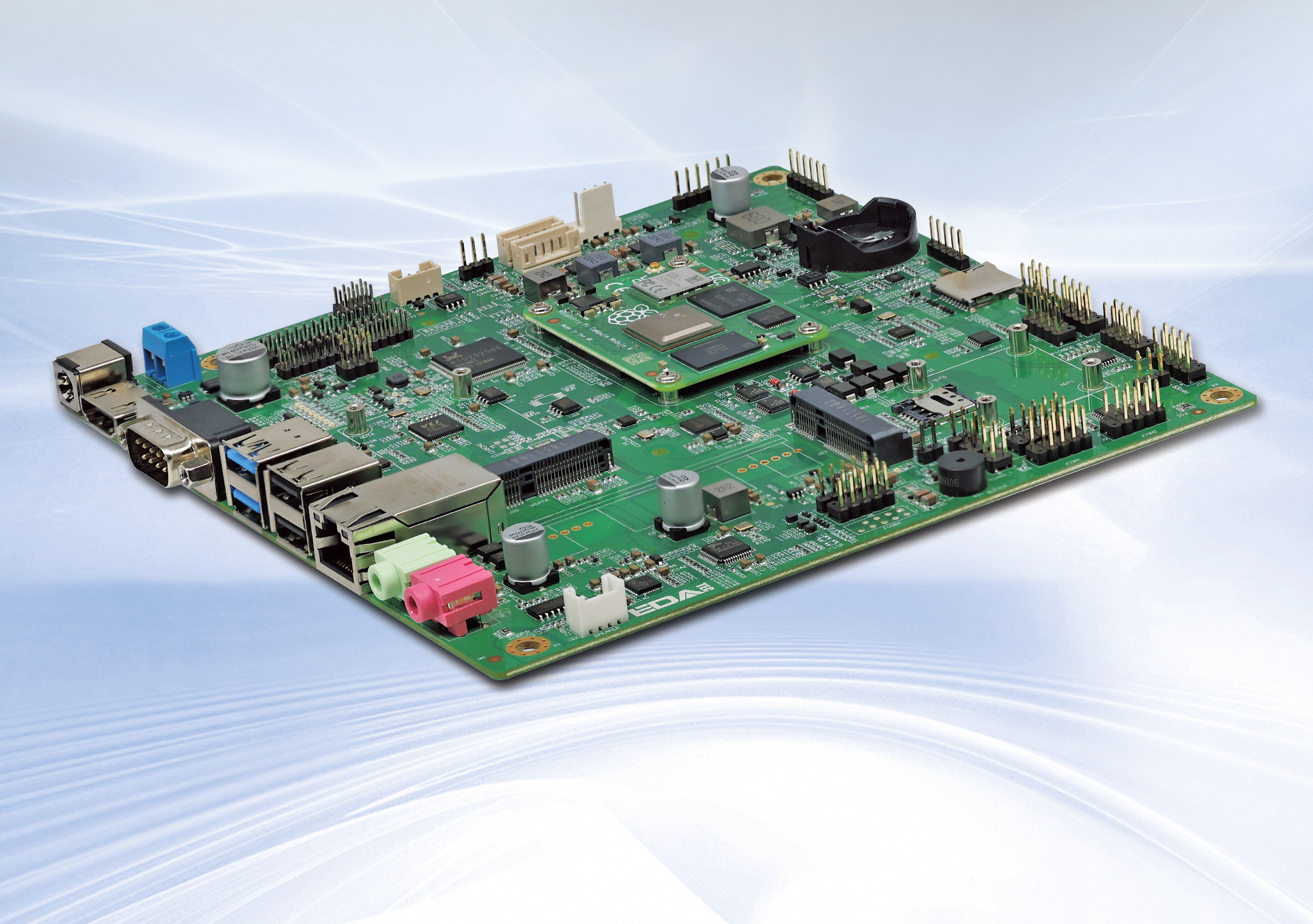The ED-SBC2300 is a Mini-ITX industrial computer motherboard developed by Shanghai Jingheng, based on the Raspberry Pi CM4. This fanless design motherboard is an excellent choice for industrial applications where space is at a premium but performance is still required. It is powered by a Broadcom BCM2711, a quad-core Cortex-A72 (ARM v8) 64-bit System on Chip (SoC) that operates at a speed of 1.5GHz, ensuring robust processing capabilities. The board can be configured with up to 8GB of LPDDR4 RAM and 32GB of eMMC storage, providing ample memory for running demanding applications. Additionally, it supports storage expansion via a Micro SD card and an mSATA SSD.