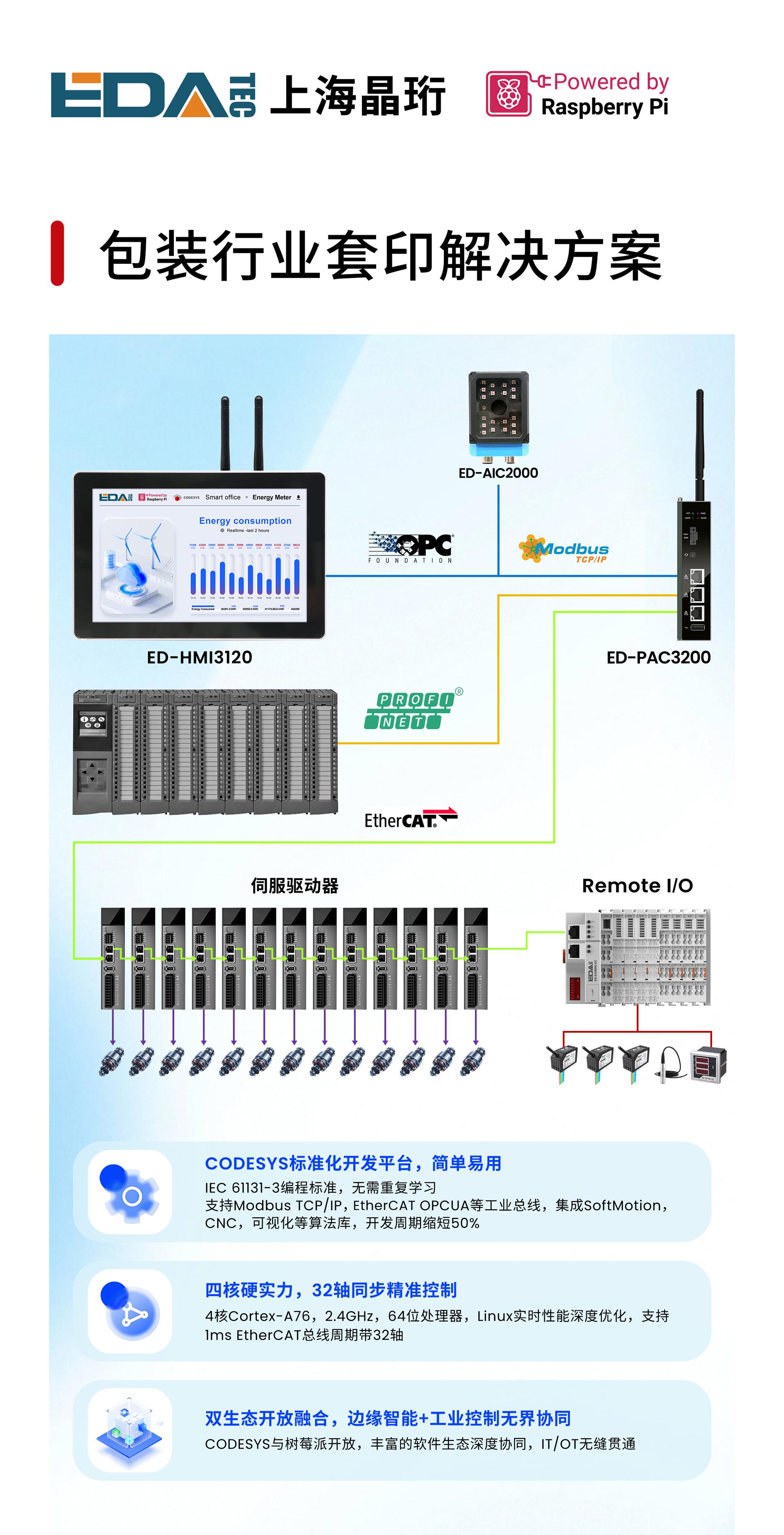 - 开放的生态融合:CODESYS 与树莓派实现开放集成,拥有丰富的软件生态系统。这种融合确保了 IT(信息技术)与 OT(运营技术)之间的深度协作,使边缘智能与工业控制能够无缝配合,为包装贴标过程带来更智能、更灵活的应用体验。