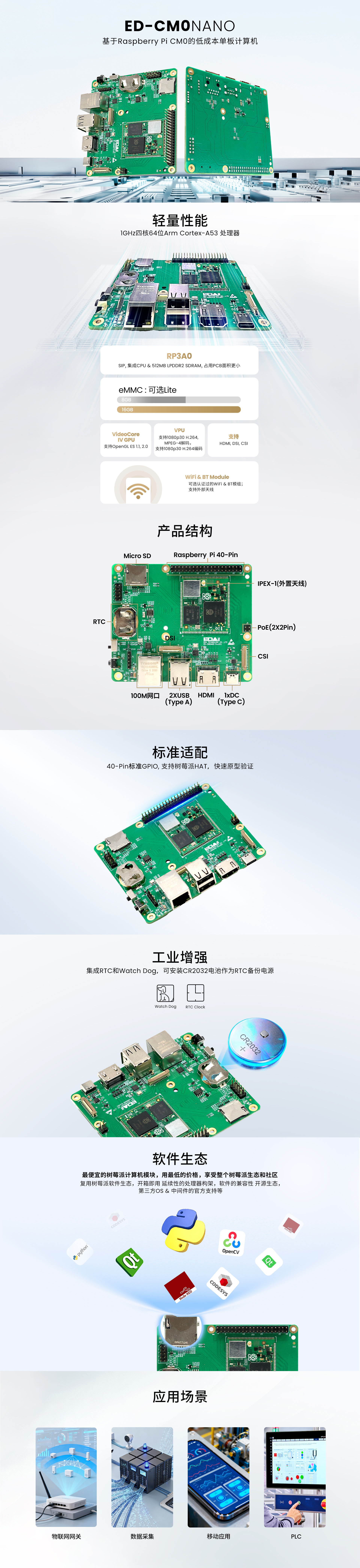 ED-CM0NANO提供灵活的型号变种,支持多种CM0核心配置可选,满足不同场景需求。接口配置丰富,集成1路HDMI、2个USB 2.0、1个100M网口,并配备MIPI DSI与MIPI CSI各1路,支持显示与摄像扩展。在工业功能方面,设备内置RTC实时时钟和Watch Dog看门狗机制,可安装CR2032电池作为RTC备份电源,保障系统持续稳定运行。为便于快速原型开发,还设有40Pin标准GPIO接口,兼容树莓派HAT扩展生态。