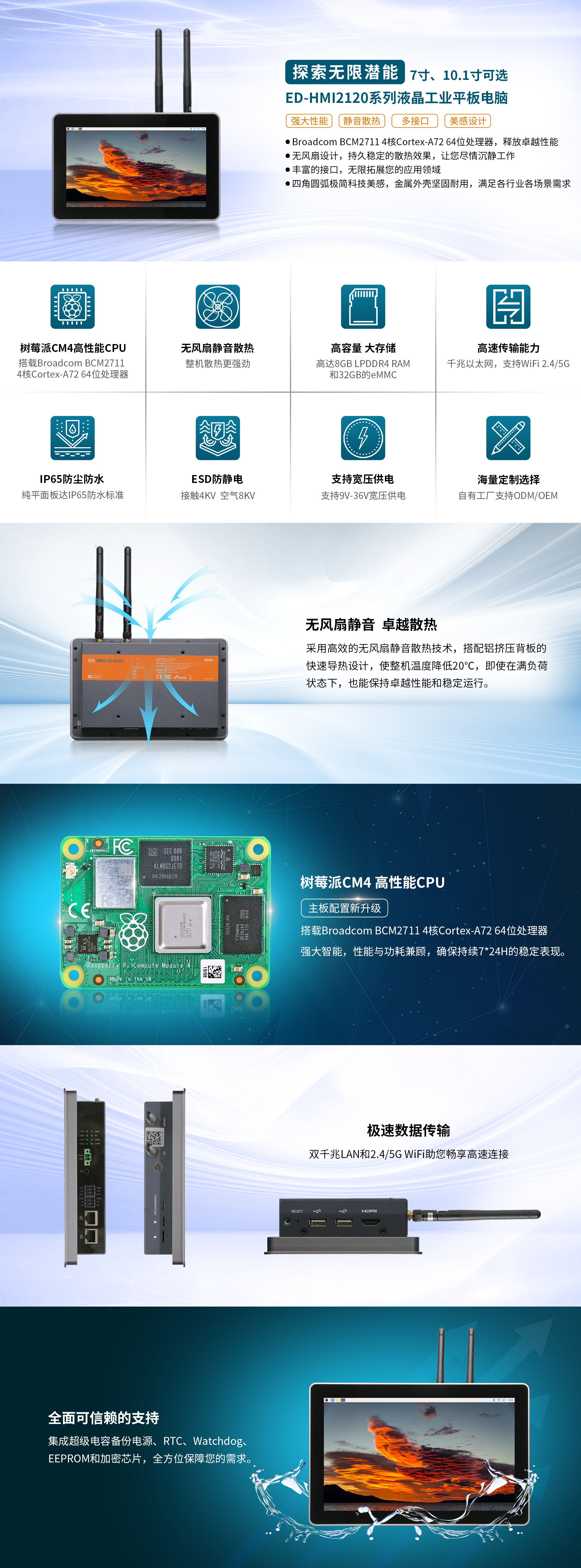 ED-HMI2120是由上海晶珩推出的工业平板电脑,它基于Broadcom BCM2711四核Cortex-A72(ARM v8)64位SoC,具备1.5GHz的处理速度,为用户提供强劲的处理能力。这款平板电脑支持1GB到8GB的LPDDR4-3200 SDRAM内存,以及8GB、16GB和32GB的eMMC闪存,同时提供了Micro SD卡槽用于扩展用户数据存储,还可选配M.2 NVMe SSD,提供了灵活的存储解决方案。