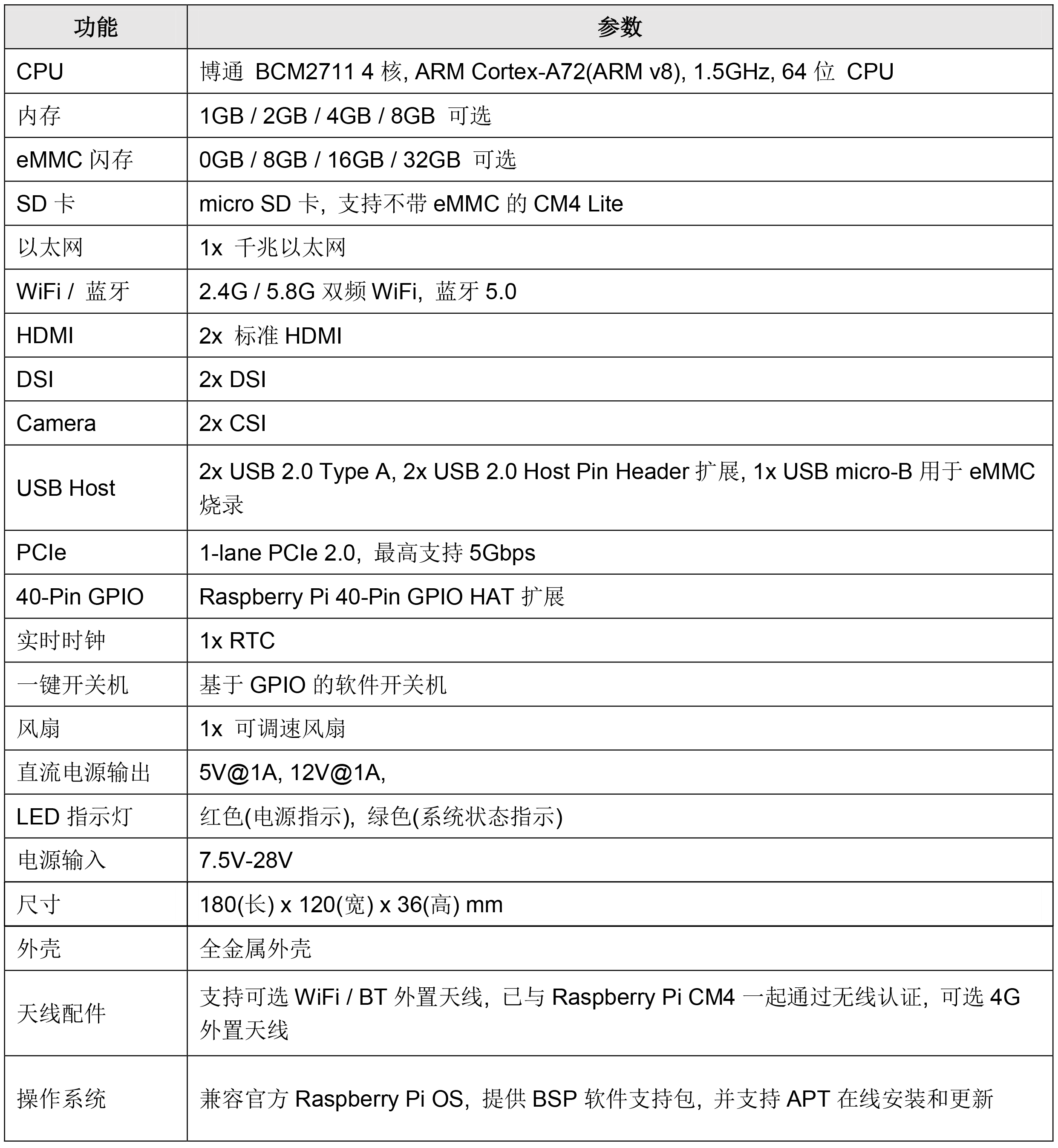 CM4 IO Computer还提供标准40针的信号扩展,用户可以通过PCI-e 1x Gen2座子扩展PCI-e设备,板载RTC可以在关闭模式下唤醒CPU,增加了设备的灵活性。处理能力方面,搭载了Broadcom BCM2711四核Cortex A72 1.5GHz(ARM v8)64位CPU,支持H.265(HEVC)(最高4Kp60解码)和H.264(最高1080p60解码,1080p30编码),以及OpenGL ES 3.0图形,提供了强大的图形和视频处理能力。
