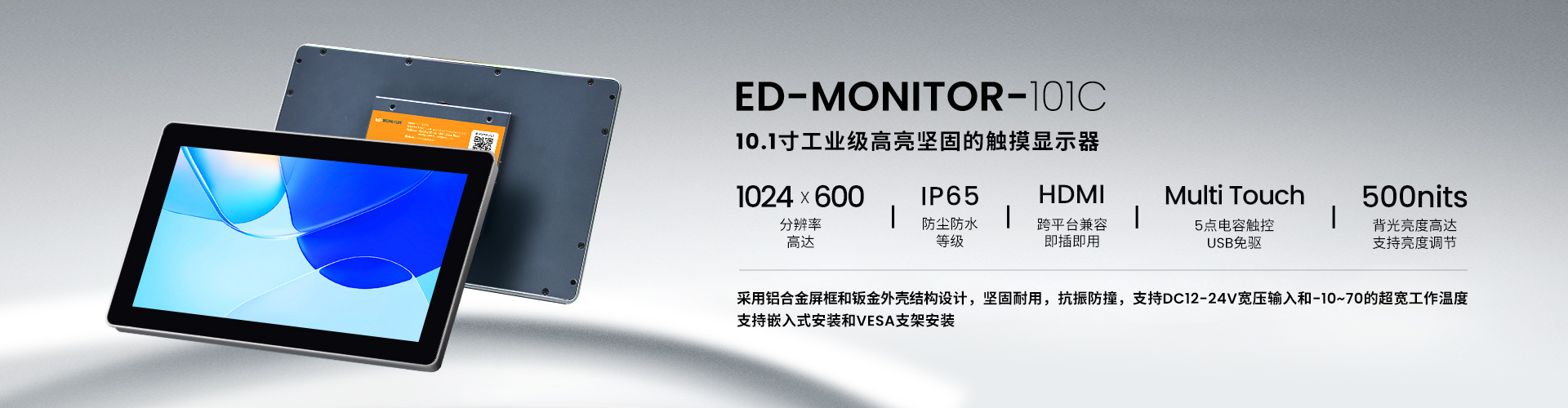 ED-MONITOR-101C是一款10.1英寸工业HDMI触摸显示器,专为工业应用场景使用而设计。分辨率高达1024 x 600, 支持USB多点触控,免驱即用,并内置音频输出接口,提供完整的多媒体融合方案,完美适配Raspberry Pi等平台。采用铝合金屏框和钣金外壳结构设计,坚固耐用,抗振防撞,前面板IP65等级防水防尘,高达500nits的背光亮度,内容清晰可见,支持DC12-24V宽压输入和-10~70的超宽工作温度,支持嵌入式安装和VESA支架安装。