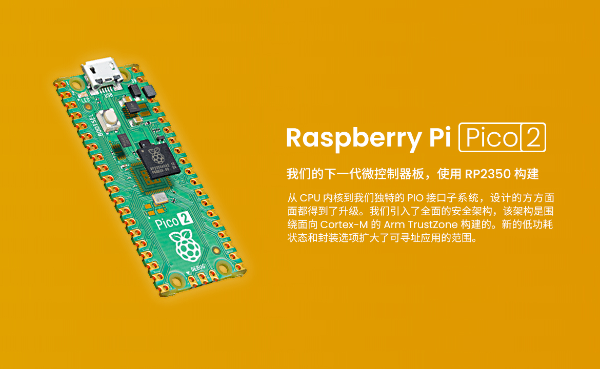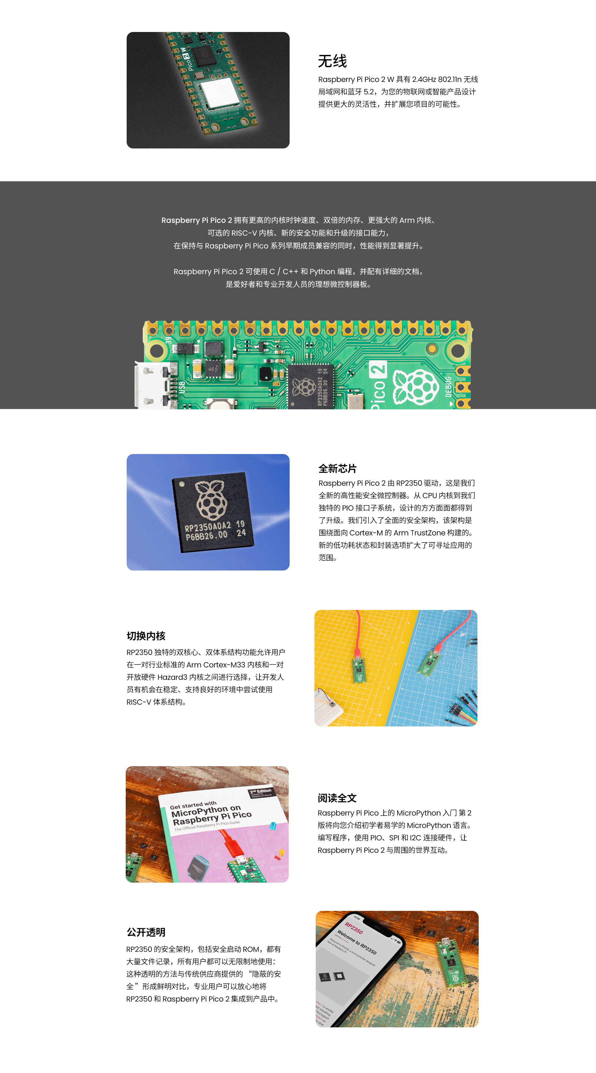 Raspberry Pi Pico 2 拥有更高的内核时钟速度、双倍的内存、更强大的 Arm 内核、可选的 RISC-V 内核、新的安全功能和升级的接口能力,在保持与 Raspberry Pi Pico 系列早期成员兼容的同时,性能得到显著提升。